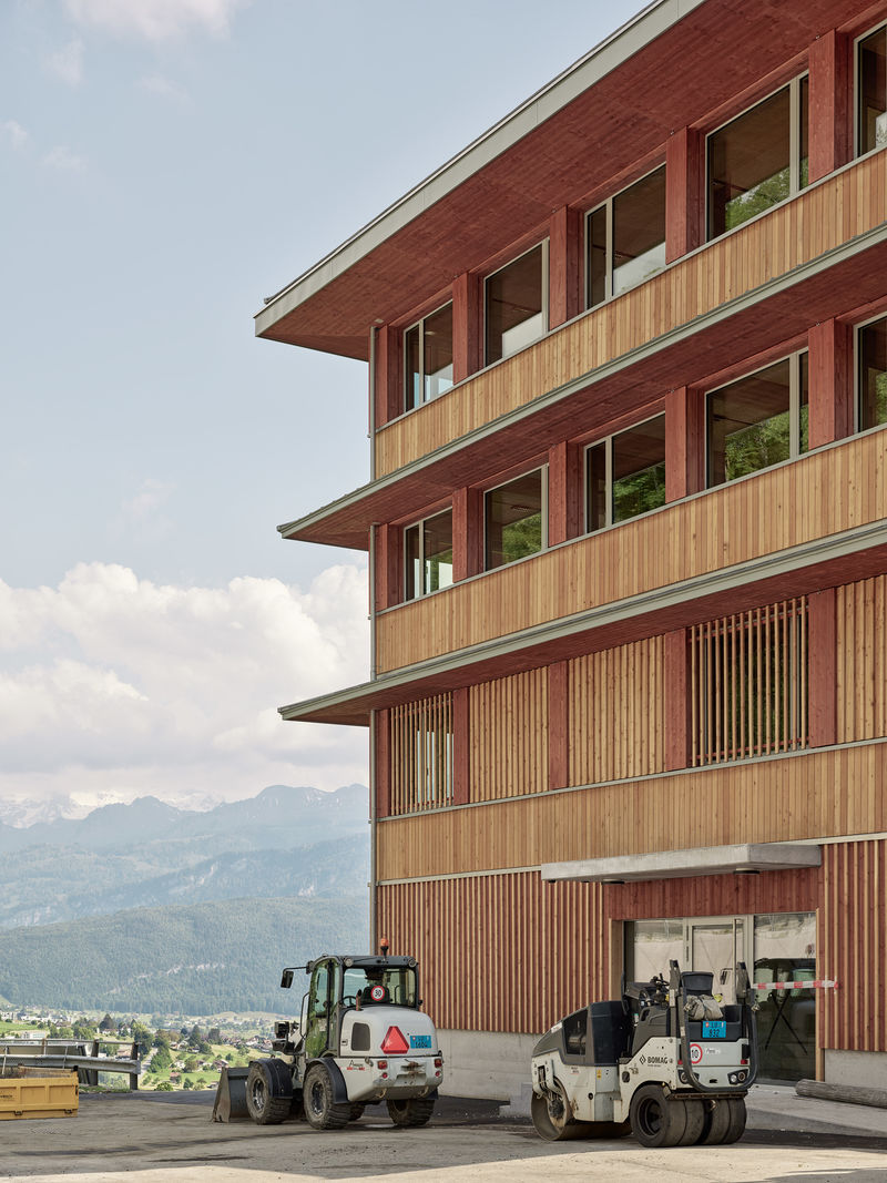 Der Sockel wurde in Beton als muraler Gebäudeteil gestaltet. Über diesen Sockel erhebt sich ein dreigeschossiger Holzbau, der den architektonischen Ausdruck des Gebäudes prägt. Innen sowie Aussen wurde mit natürlichen und dauerhaften Materialien gebaut.