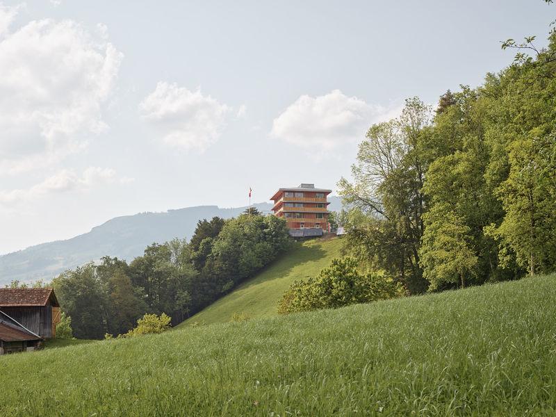 Ein sorgfältig gestalteter Holzbau fügt sich harmonisch in den Landschaftsraum. Durch die Verwendung von ortsüblichen und viel natürlichen Materialien, entsteht eine harmonische Wechselwirkung zwischen den Bauten und der sie umgebenden Landschaft. Eine zurückhaltende und natürliche Farbgebung unterstützt die gute Eingliederung in den Kontext.