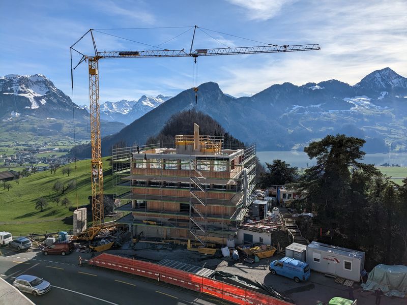 Ein Ziel des Büro- und Restaurantneubaus besteht darin, den C02-Ausstoss in der Erstellung und dem Betrieb zu reduzieren, sowie die Kreislauffähigkeit der Konstruktion zu optimieren. Das Tragwerk aus einer Skeletttragstruktur aus Buchenholz, ermöglichen eine hohe Flexibilität sowie ein grosses Mass an Trennbarkeit und Recyclierbarkeit.