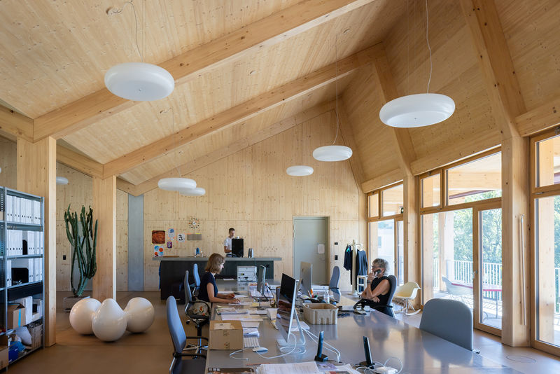 Die Schönheit zeigt sich in der sinnfälligen und einfachen Konstruktion. Sie ermöglicht ein vielfältiges Raumangebot. Die zweiseitig belichteten Geschosse mit den angrenzenden Aussenflächen der Lauben und des Gartens bieten eine angenehme Arbeitsatmosphäre. Licht, Luft und Raum sind grosszügig vorhanden. Das auch im Innenraum präsente Baumaterial Holz verleiht den Büros und Ateliers einen fast wohnlichen Touch.