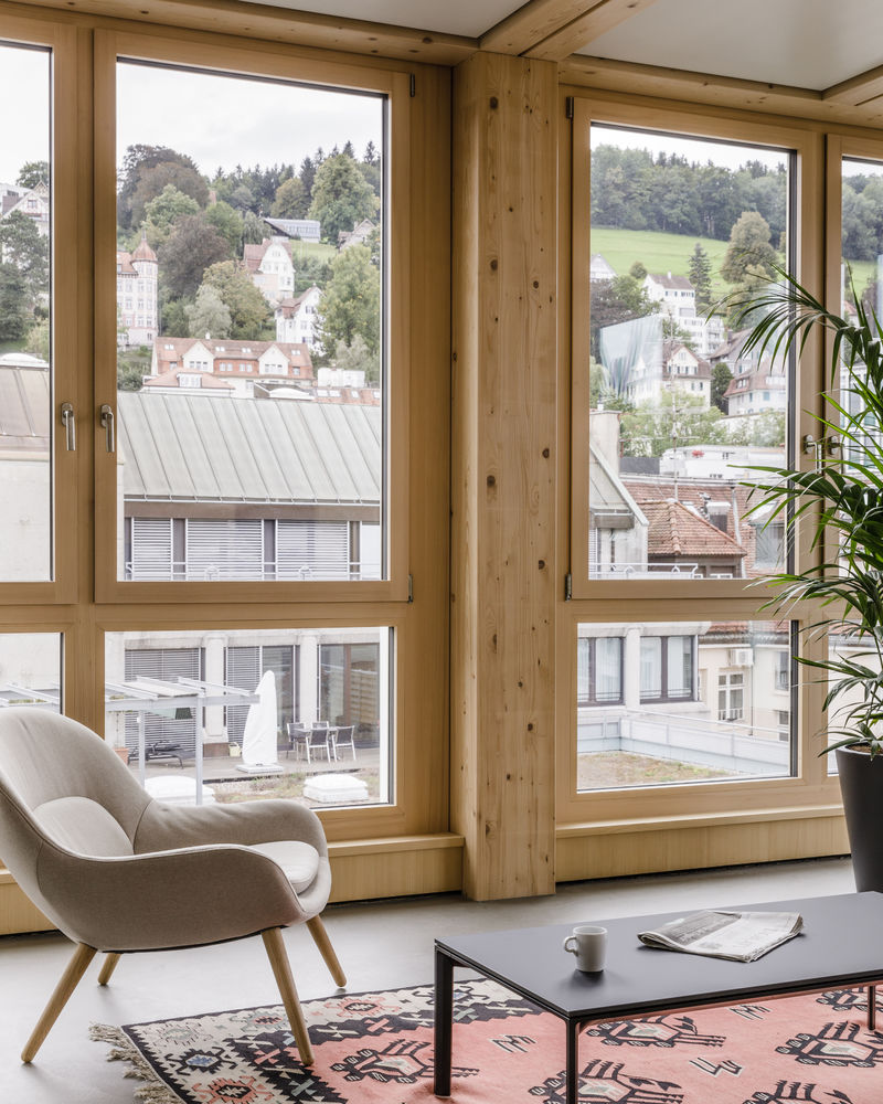 Dem historischen Kontext entsprechend wählten wir eine mineralische Fassade, die sich an die verputzten oder natursteinverkleideten Nachbargebäude anlehnt, und die Holzkonstruktion zum Ausdruck bringt. Konkave, gewellte Elemente aus grünlichem Faserzement wirken steinern und, passend für die Textilstadt St. Gallen, leicht wie ein Vorhang. Das elegante Grün, mit den messingfarbenen Fenstern strahlt italienische Eleganz aus – ein Massanzug für das Haus und eine Reminiszenz an den Vorgängerbau.