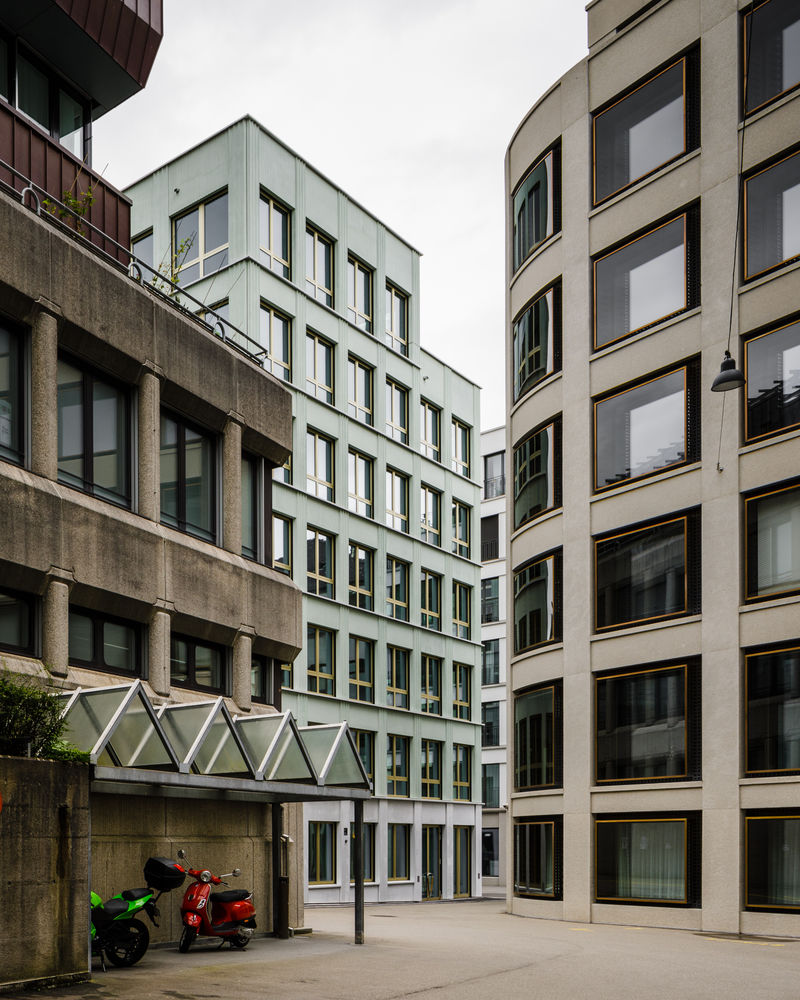 Mit seinem schlichten Volumen, das gegen die Frongartenstrasse und zum rückwärtigen Hof profiliert ist, sich gegen die beiden angrenzenden Blockrandbauten aber neutral verhält, fügt sich das Gebäude ohne übertriebene Gestik selbstverständlich in den Blockrand ein.