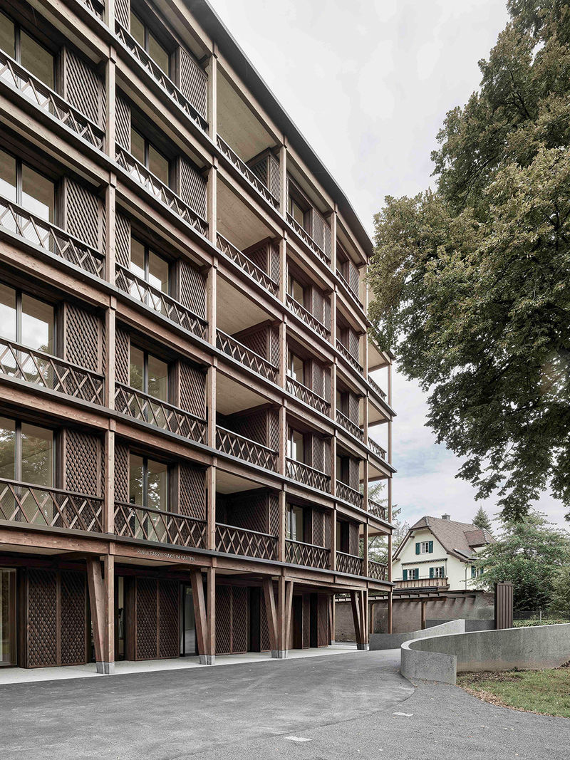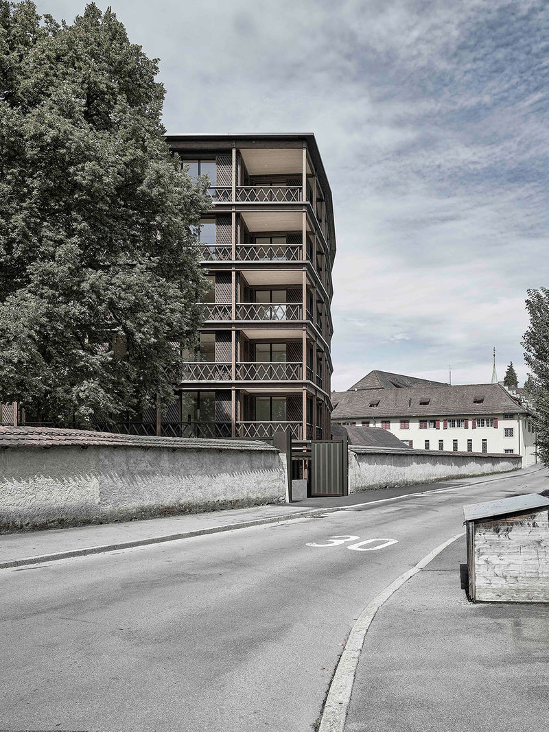 Das in Holz gehaltene Wohngebäude im Kapuzinergarten ist im Zusammenspiel mit den naheliegenden Ökonomiegebäuden zu verstehen und ergänzt atmosphärisch die Klosteranlage. Das Gebäude ist typologisch kompakt um einen Kern herum organisiert, welcher als Lichthof mit einer durchgehenden Galerie, einer Treppenanlage und einem Aufzug gestaltet ist. Im Erdgeschoss befinden sich die Einfahrt zur Tiefgarage, die Veloplätze, der Haupteingang mit den Briefkästen sowie eine zum Garten orientierte Praxis. In den Obergeschossen befinden sich jeweils vier 98m2 grosse 3,5 Zimmer-Eckwohnungen und zwei 61m2 grosse 2,5 Zimmer-Wohnungen. Der Treppenkern und die Trennwände der Wohnungen sind aus Stahlbeton gefertigt, das Tragwerk besteht aus einer Holz-Beton-Verbundkonstruktion, nichttragende Innenwände und die Aussenwand sind als reine Holzständerwände ausgeführt. Der offene Laubengang entlang der Klostermauer verbindet das neue Gebäude mit der historischen Klosteranlage und vervollständigt das Ensemble.