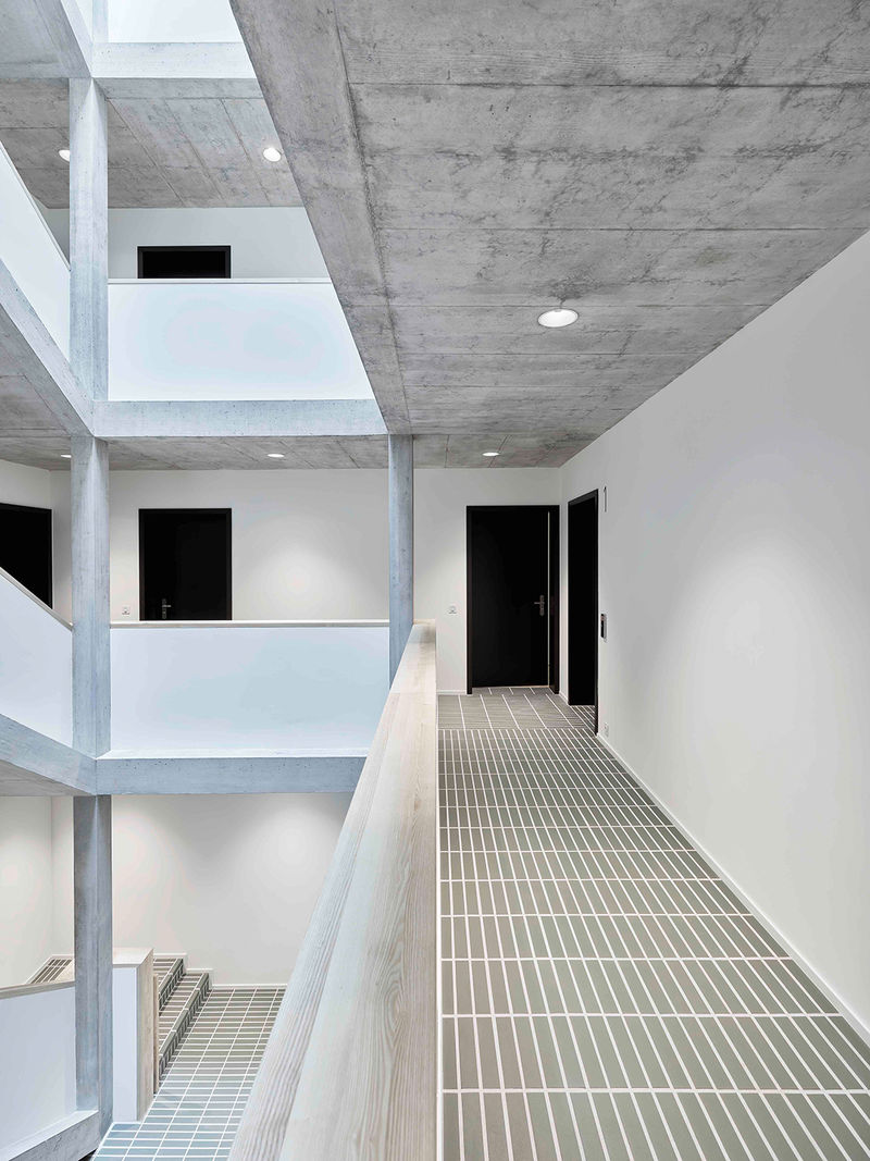 Der sechsspännige Grundriss ermöglichte es auf einer minimalen Grundfläche eine maximale Anzahl an Wohnungen zu generieren. Weiter konnten die Grundrisse mit einer optimalen Belichtung und raumklimatischen Qualität ausgestattet werden. Die Verwendung der roh belassenen Baustoffe Holz und Beton verzichtet auf eine aufwändige Bearbeitung der Oberflächen. Die präzisen und dennoch einfachen Details unterstützen die optische und funktionale Qualität des Baus.