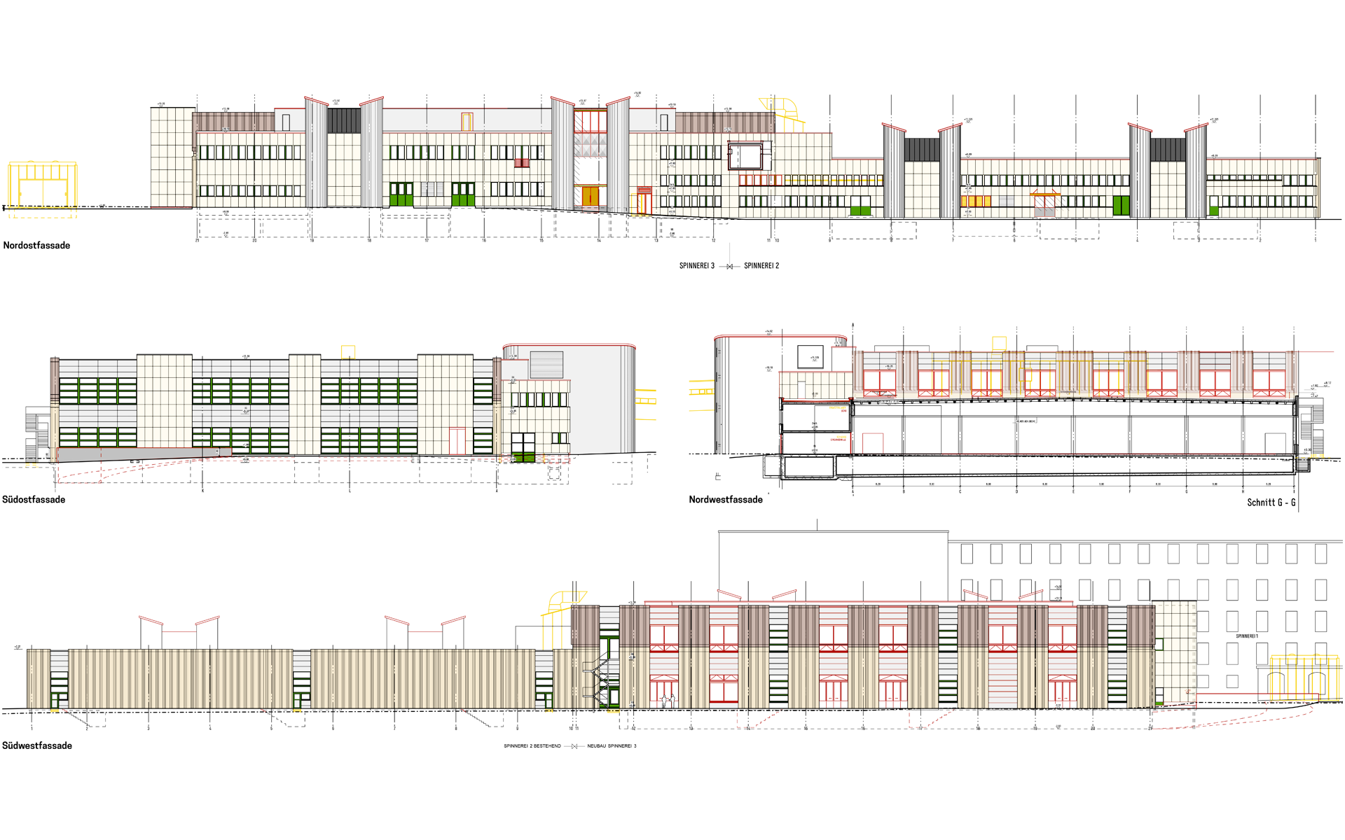 Das Gebäude der Spinnerei 2 und 3 aus den 80er Jahren ist funktional konzipiert: drei Hallen, zwei davon gestapelt, werden durch einen Lateralbau verbunden. Die grossflächigen Hallen mit je 3500m2 Grundfläche, zusammen rund zwei Fussballfelder gross, werden durch den kleinteiligen Servicetrakt mit Infrastruktureinrichtungen versorgt. Die Transformation erfolgt primär mit drei Massnahmen:
