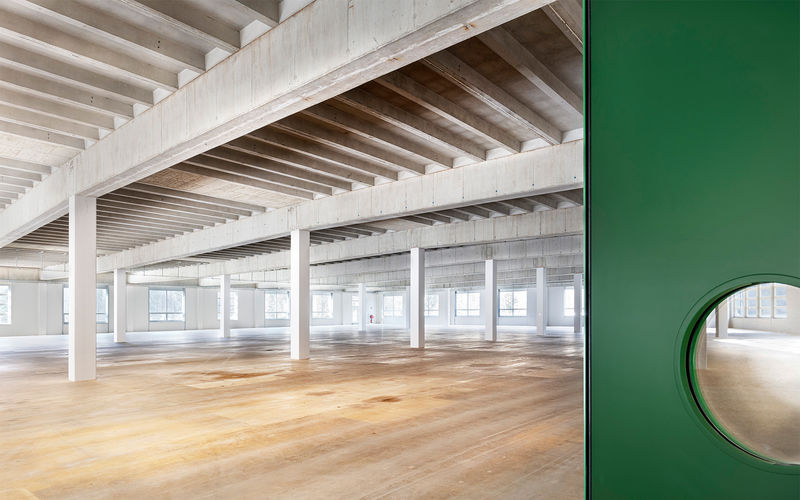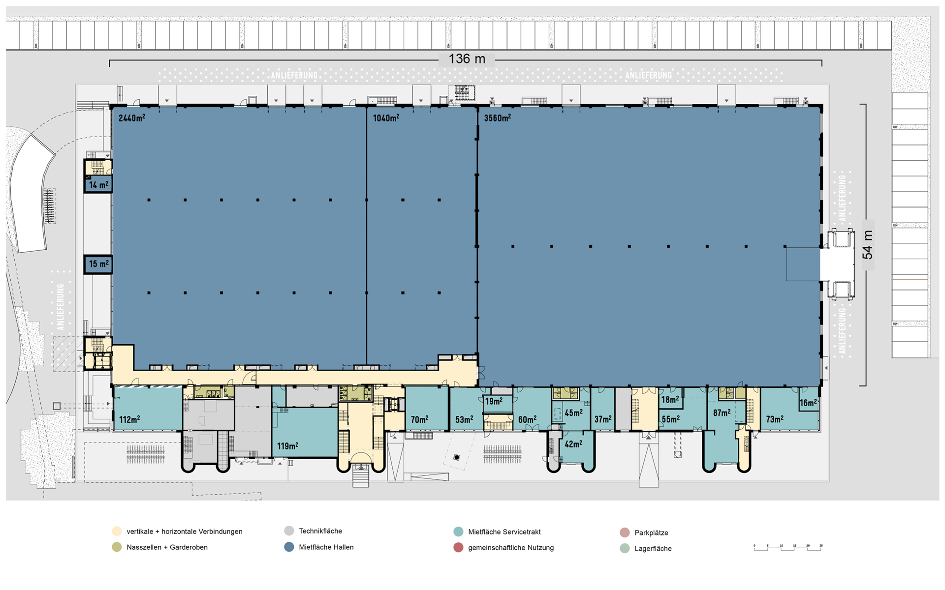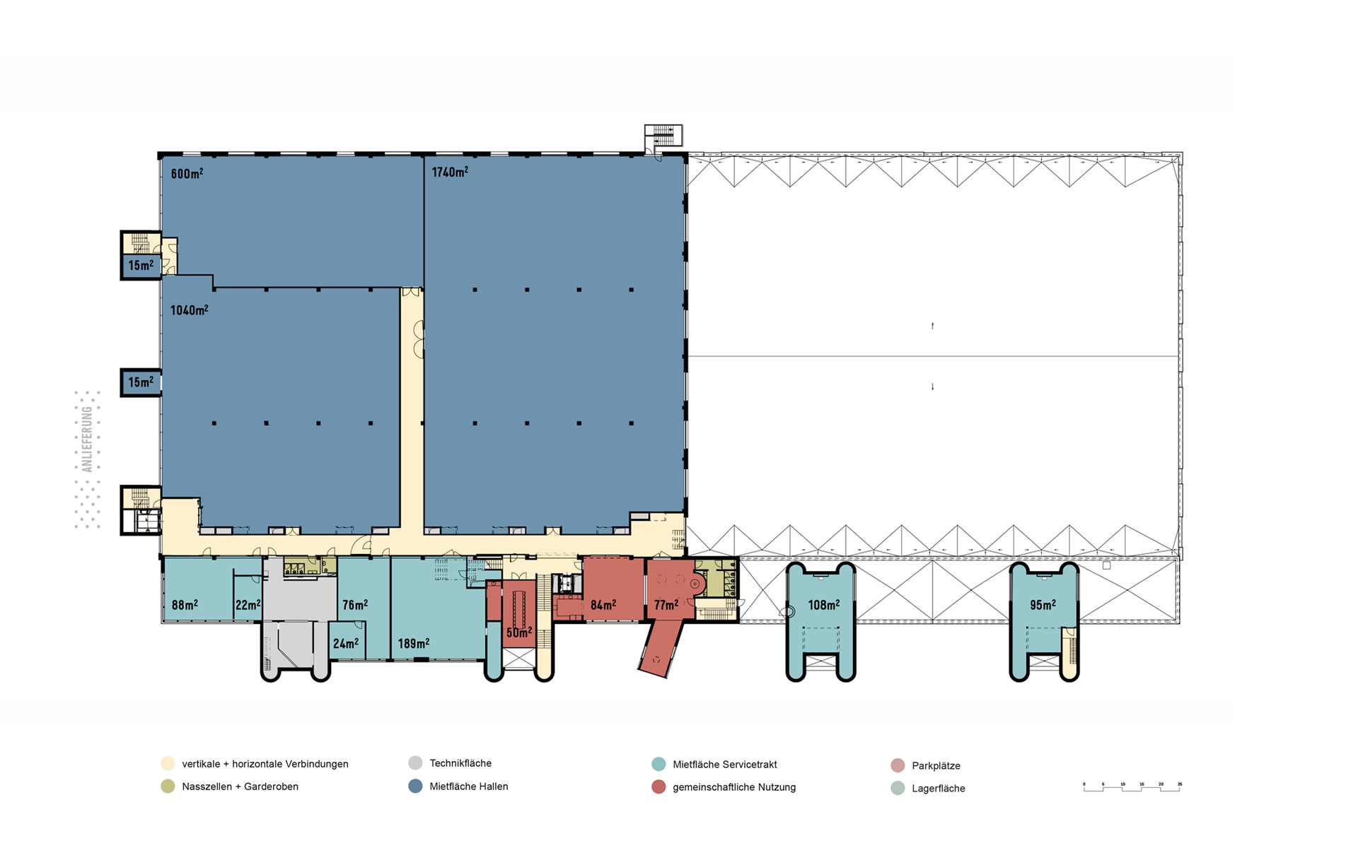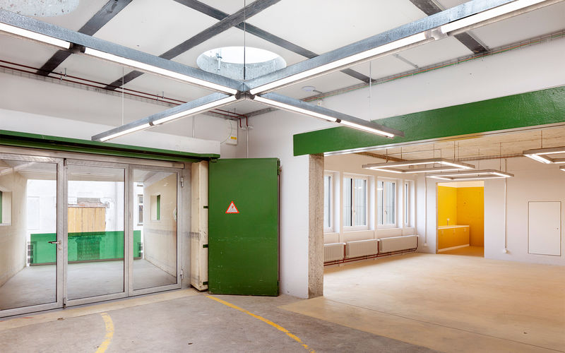 Wo bestehende Strukturen nicht bereits eine wirtschaftliche Einheit definieren, werden die Mieteinheiten mit rückbaubaren Leichtbauwänden unterteilt. Die rück- und wiederaufbaubare Montage der Wände ermöglicht eine langfristige Variabilität insbesondere der grossen Hallenbereiche in ihrer Nutzung. Der gleichen Idee der Adaptierbarkeit folgen die offen montierten haustechnischen Installationen.