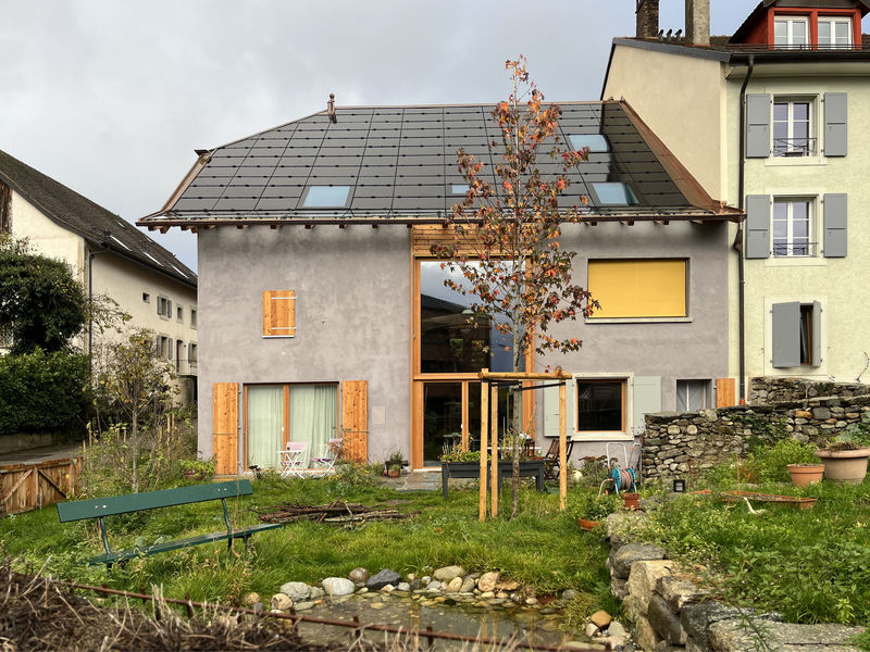 Le chauffage du bâtiment est 100% renouvelable, son utilisation et sa masse thermique le rendent vertueux en été comme en hiver. Le béton a uniquement été utilisé là où nécessaire, en contact avec le sol. Le reste est en bois, neuf ou en grande partie de réemploi. Les tuiles, menuiseries intérieures et les sanitaires sont également en éléments de réemploi. Des briques de terre crue récupérée du site ont été construites lors d’un chantier participatif.
