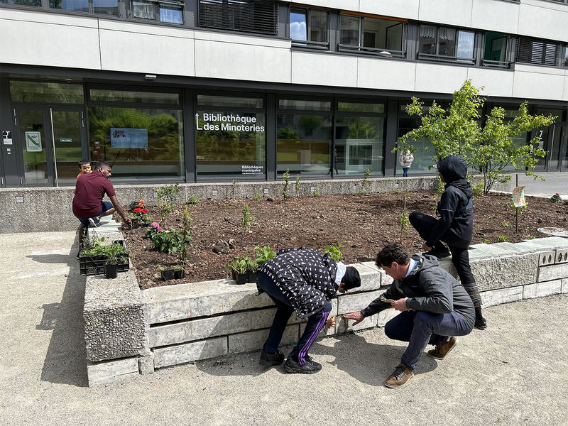 À la fin du chantier de réhabilitation des logements aux Minoteries, une démarche participative a consulté les habitant·e·s et les différents acteurs associatifs du quartier sur les besoins d’aménagement et une installation éphémère a été réalisée. Le projet d’aménagement a poursuivi la dynamique en faisant participer pleinement petits et grands dans la construction et la végétalisation des bacs. Une convention entre la ville et les habitants a été établie pour l'entretien d'une partie des bacs.