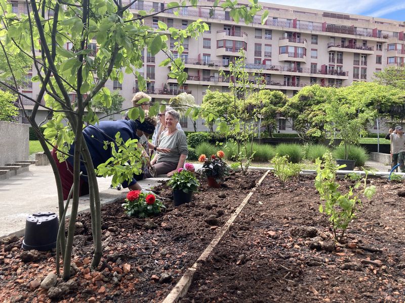 La pérennisation des aménagements a été discutée avec les différent·e·s actrices et acteurs et voisin·e·s concerné-e-s. Ainsi, le projet s’est ouvert dans ses limites pour intégrer les espaces voisins. Il a aussi évolué en prêtant attention aux besoins de confort (bancs avec dossier, balancelles) et aux spécificités attendues d’un public à la fois âgé et jeune (ombrage, coins d’intimité, espaces de jeux, pétanque). Les micros séjours et lieux de convivialité ont été pensés pour tou·t·e·s.