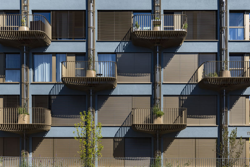 Das Konzept für diese begrünten versetzten Balkone war, den sozialen Aspekt unter den Mietern zu stärken. Große Blumentöpfe, von VOLPATOHATZ entworfen , wurden auf jedem Balkon direkt unter jeder Rankhilfe platziert. Kletterpflanzen klettern den Rankhilfen entlang, um die Unterseite des Balkons zu erreichen und schließlich die Brüstung des Nachbarn zu umhüllen. wobei diese Pflanzen den Mietern einen Grund geben, sich um ihre Pflanzen zu kümmern, auch dem Nachbar zuliebe.