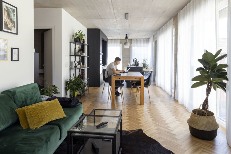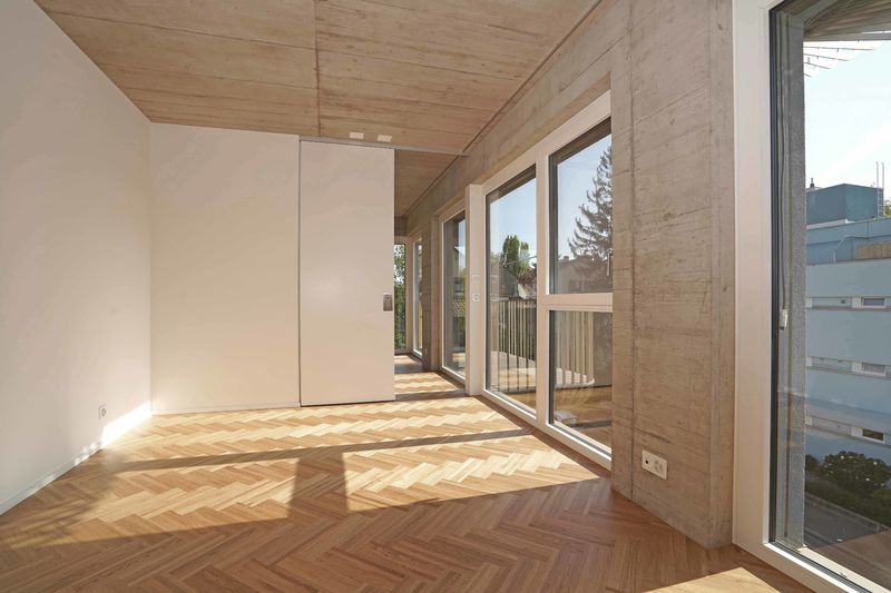 Das Gebäude besteht aus einem Kern und einer tragenden Aussenwand. Dazwischen kann der Raum flexibel angepasst, oder Strangsanierungen nach mehreren Jahren einfach ersetzten werden. Lichtdurchflutete fliessende Räume. Tragende Decken und Wände sind in Beton roh belassen und die Balkone sind komplett aus Stahl, verzinkt und pulverbeschichtet. Es wurde darauf verzichtet Materialien zu kombinieren, um den Prozess der Demontage und des Recyclings in Zukunft einfacher zu machen.