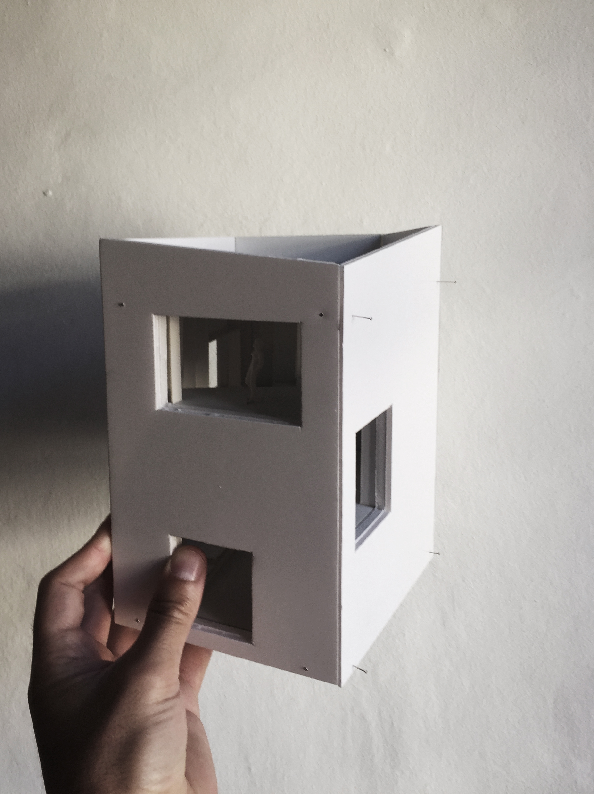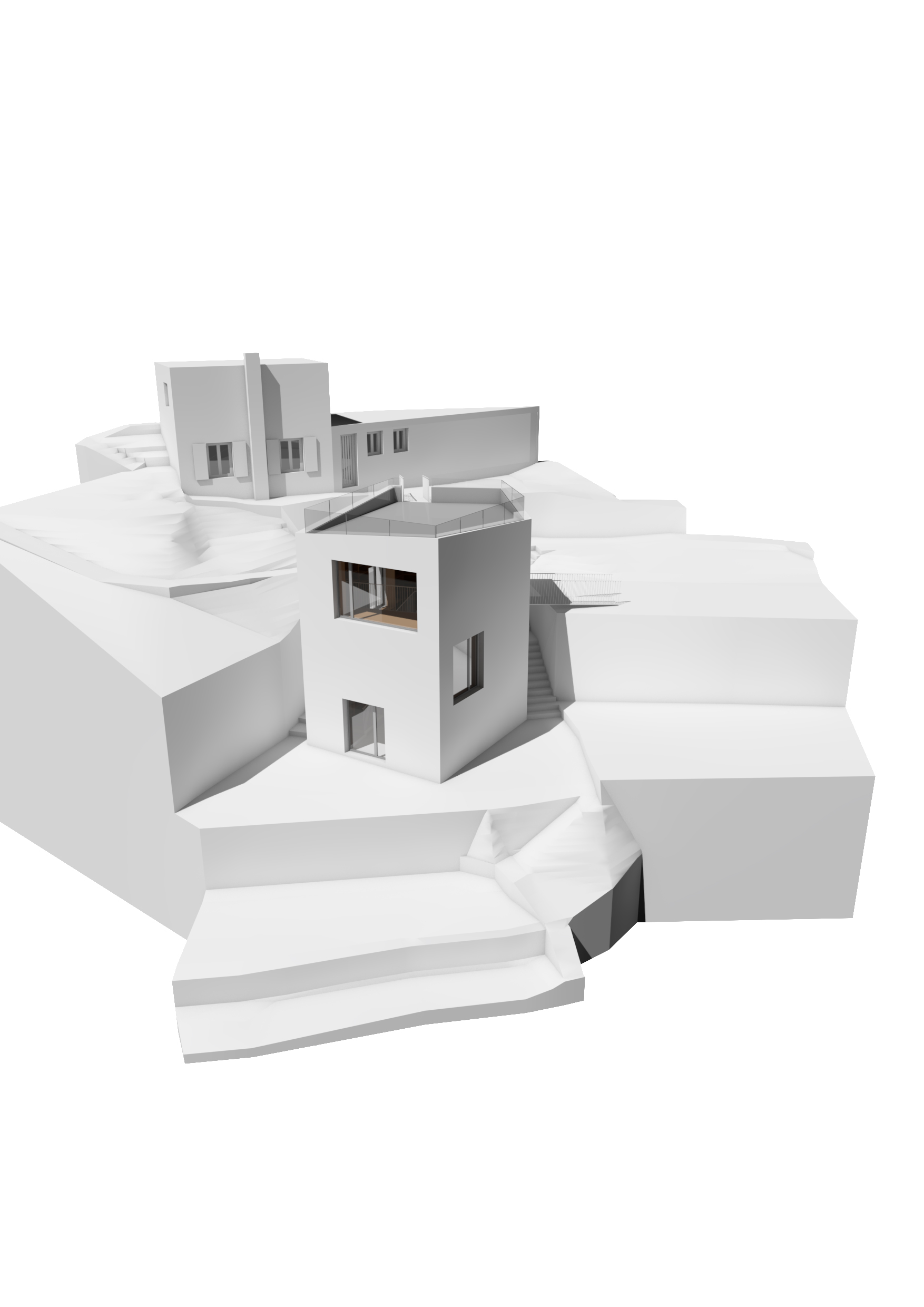 La distribuzione è assicurata da una scala a spirale periferica che con passo lento e confortevole collega due terrazze interne ad altrettanti accessi esterni, innestandosi di fatto nella passeggiata del giardino esistente. Tre grandi aperture concentrano le viste anziché aprirle a tutto raggio, offrendo nicchie di contemplazione nelle quali perdersi comodamente avvolti dalla lettura. Sul tetto trova infine spazio una terrazza panoramica.