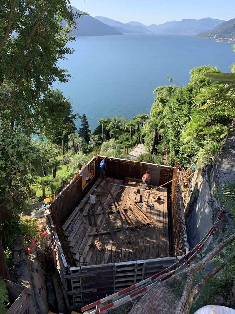 Il progetto prende vita nella rigogliosa vegetazione di un giardino privato arroccato sopra il Lago Maggiore. La vista è mozzafiato e i terrazzamenti esistenti creano una rete di camminamenti che attraversano la proprietà. La situazione offre perspettive e ambienti suggestivi, a momenti esposti all’accecante luce del sole, altre volte all’ombra di un grande ginkgo o ai piedi di una parete rocciosa. Il panorama come un vasto quadro senza cornice collega la costa svizzera a quella italiana.