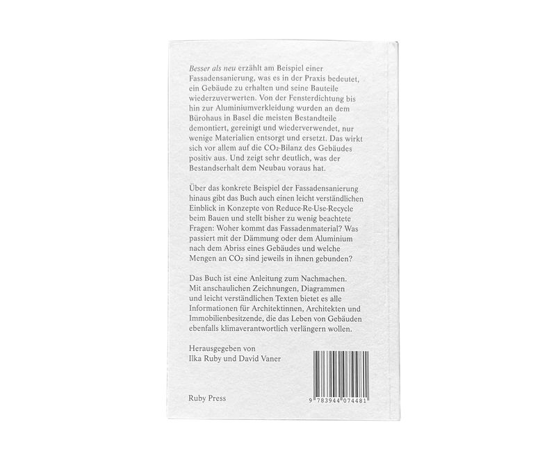 Die Publikation zur Fassadensanierung «Besser als neu» ist ein konkretes Beispiel das einen leicht verständlichen Einblick in die Konzepte Reduce, Re-Use, Recycle beim Bauen gibt. Die Dokumentation als Handbuch und als Anleitung zum Nachmachen stellt wichtige Fragen zur Ressourcen Suffizienz, welche in unserer Ausbildung und in unserem Alltag bisher wenig Beachtung hatte. Das Verstehen und das Pflegen des Vorhandenen leisten einen wertvollen Beitrag an unsere Umwelt.