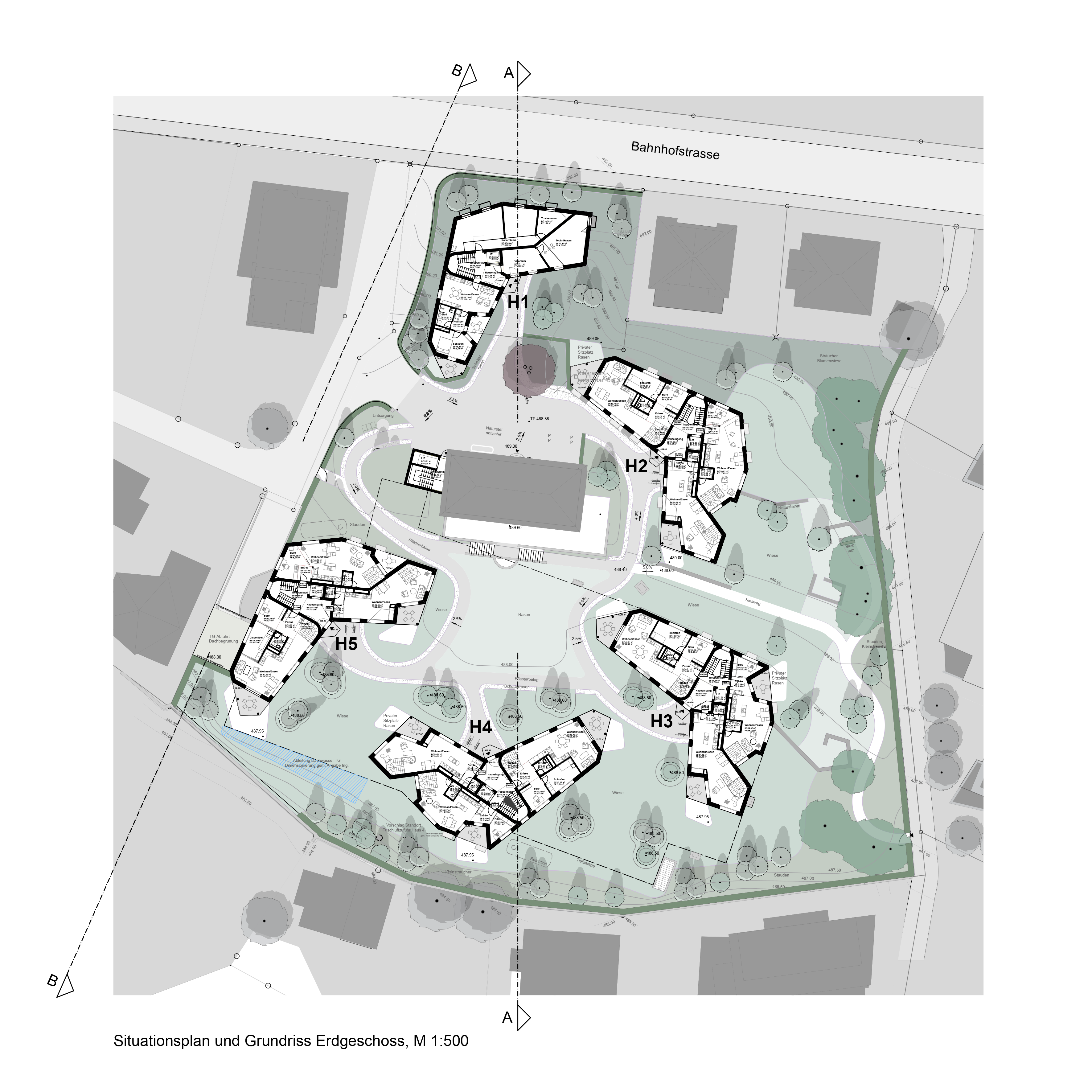 Die Überbauung ist horizontal in zwei Ebenen geschichtet. Anwohner und Besucher parkieren im Untergeschoss. Das Erdgeschoss ist den Fussgängern vorbehalten. Punktuell sind die Ebenen miteinander erschlossen und für die jeweiligen Hausbewohner zugänglich. Die Umgebung mit dem alten Baumbestand dient für alle Bewohner als Gemeinschafts- und Erholungsbereich.