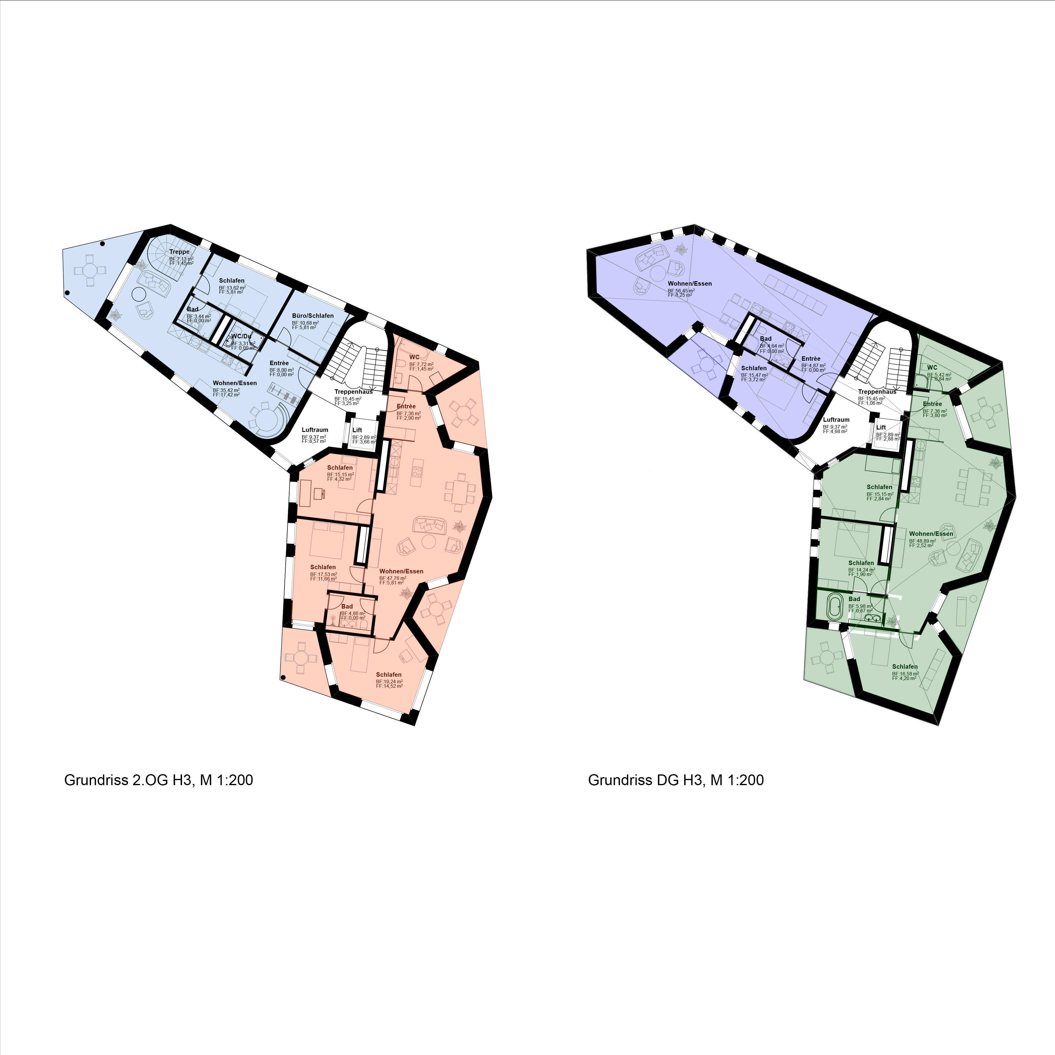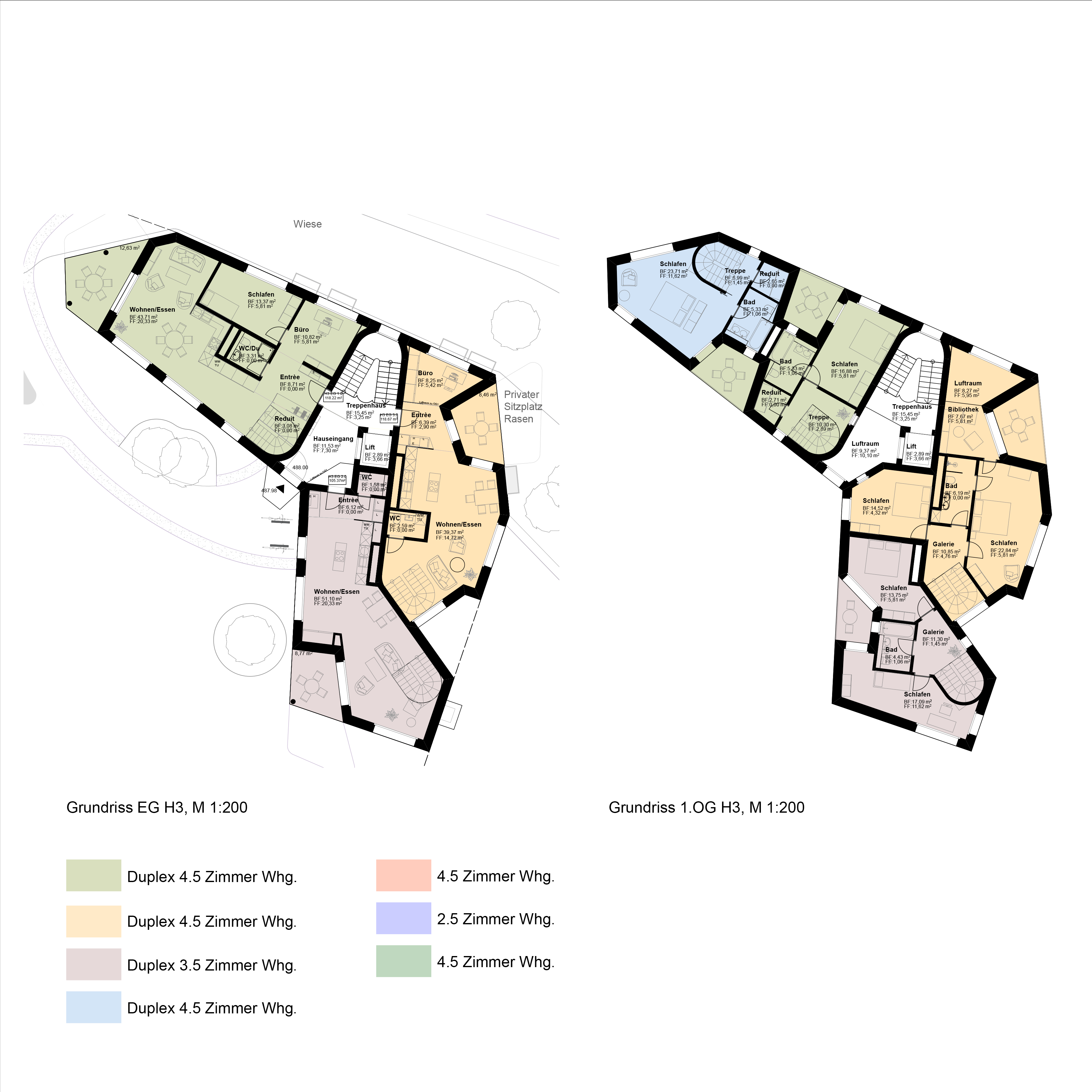 Die Wohntypologien haben eine Durchmischung mit 1- bis 4 - Zimmer Wohnungen auf jeweils 1 bis 2 Ebenen. Durch die unterschiedliche Anordnung der Gebäude um die Villa im Park entsteht eine individuelle Wohnsituation für jede Wohnung. Die Villa und der Gemeinschaftsraum ergänzen für alle Bewohner das Wohnangebot und die gestaltete Umgebung und Landschaft motivieren für gemeinsame Aktivitäten.
