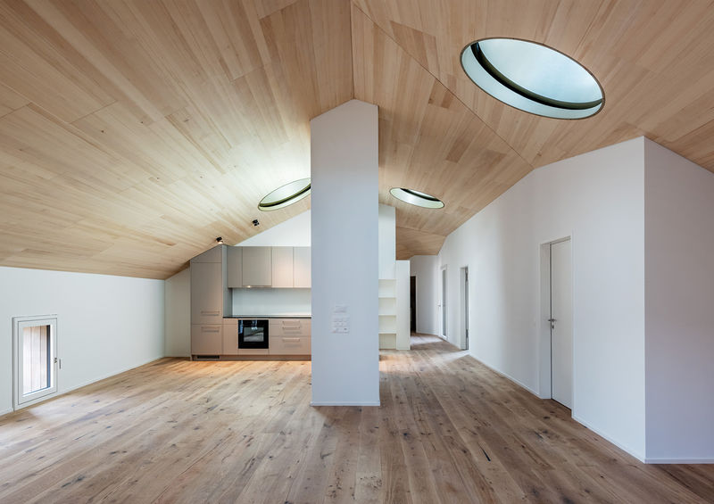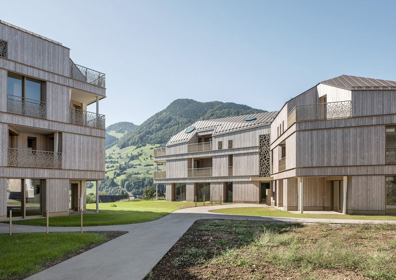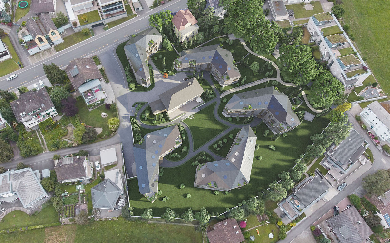 Die Wohnverdichtung des Grundstücks bewahrt dem Bestand der Villa und Baumbestand der Parkanlage. Die fünf Neubauten umringen die bestehende Villa und verleihen dem Standort eine kontrastvolle Identität (Alt und Neu). Die abwechslungsreichen Grundrisstypologien mit unterschiedlichen Lagen bestehen zur Hälfte aus Duplex Wohnungen und öffnen sich über unterschiedliche Fensterhöhen und Ausrichtungen zur umgebenden Parkanlage. Es entstehen sowohl innenräumlich als auch aussenräumlich bereichernde Sichtbezüge mit unterschiedlichen Durchblicken, Orientierungszeichen und -richtungen zur Park- und Berglandschaft. Die Dachlandschaft der Neubauten lehnt sich am Baubestand und an die umgebende Bergsilhouette an.