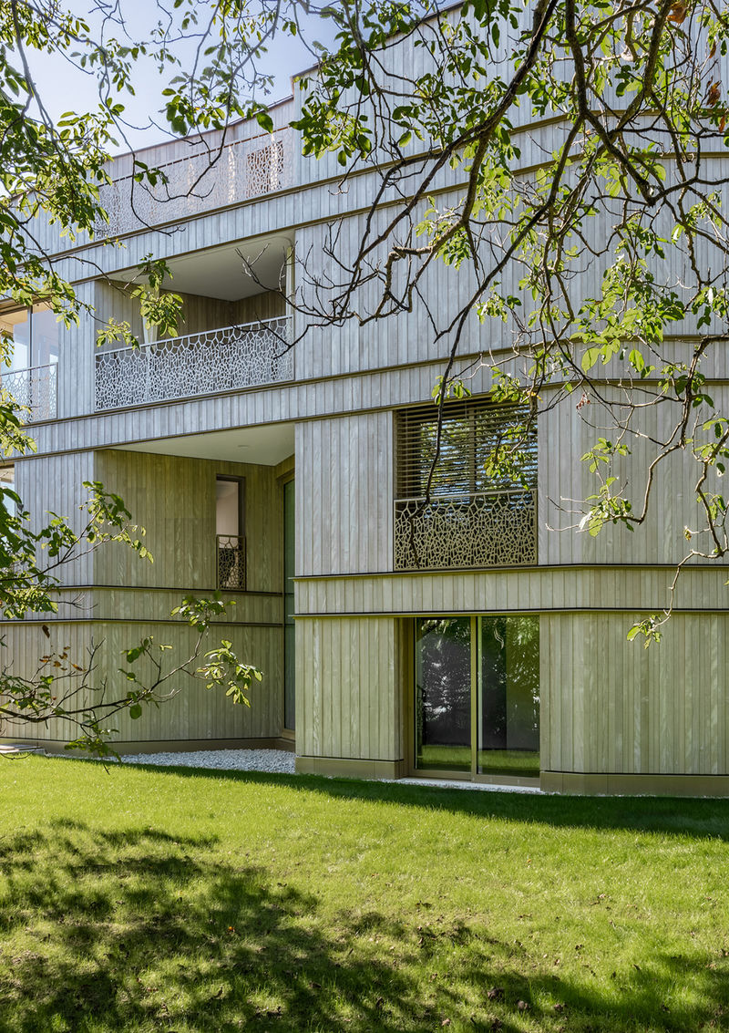 Die Überbauung definiert das Umfeld der Villa neu und lässt Raum für die Interaktion mit der Parkanlage. Für Altbau und Neubau wird ein Mehrwert durch mehr Freiraum geschaffen. Technisch erfüllen die Neubauten den Minergie- Standard mit kontrollierter Lüftung und integrierter PV- Anlagen auf dem Dach. Die Gebäude bestehen aus einer hybriden Baukonstruktion mit Erschliessungskern und Geschossdecken aus Beton und sämtliche Fassaden und Dach aus Holzfertigelementen.