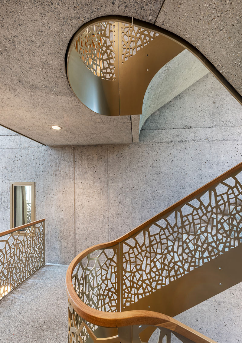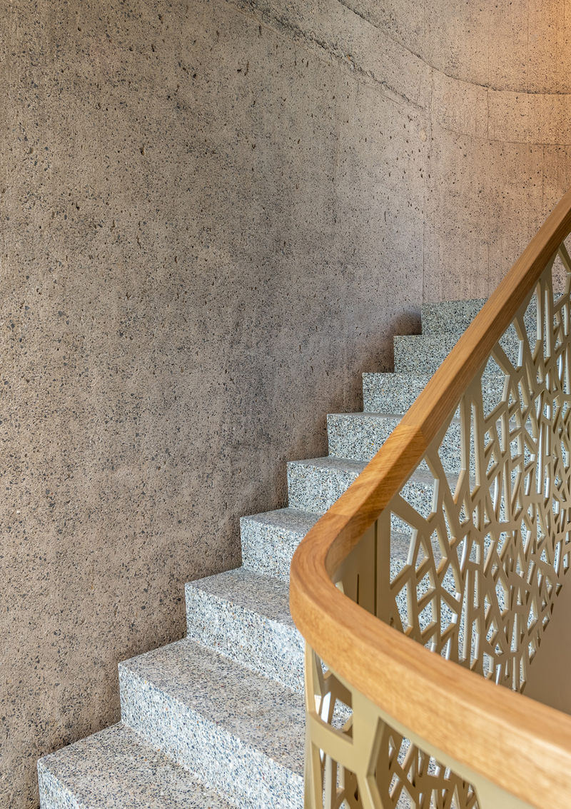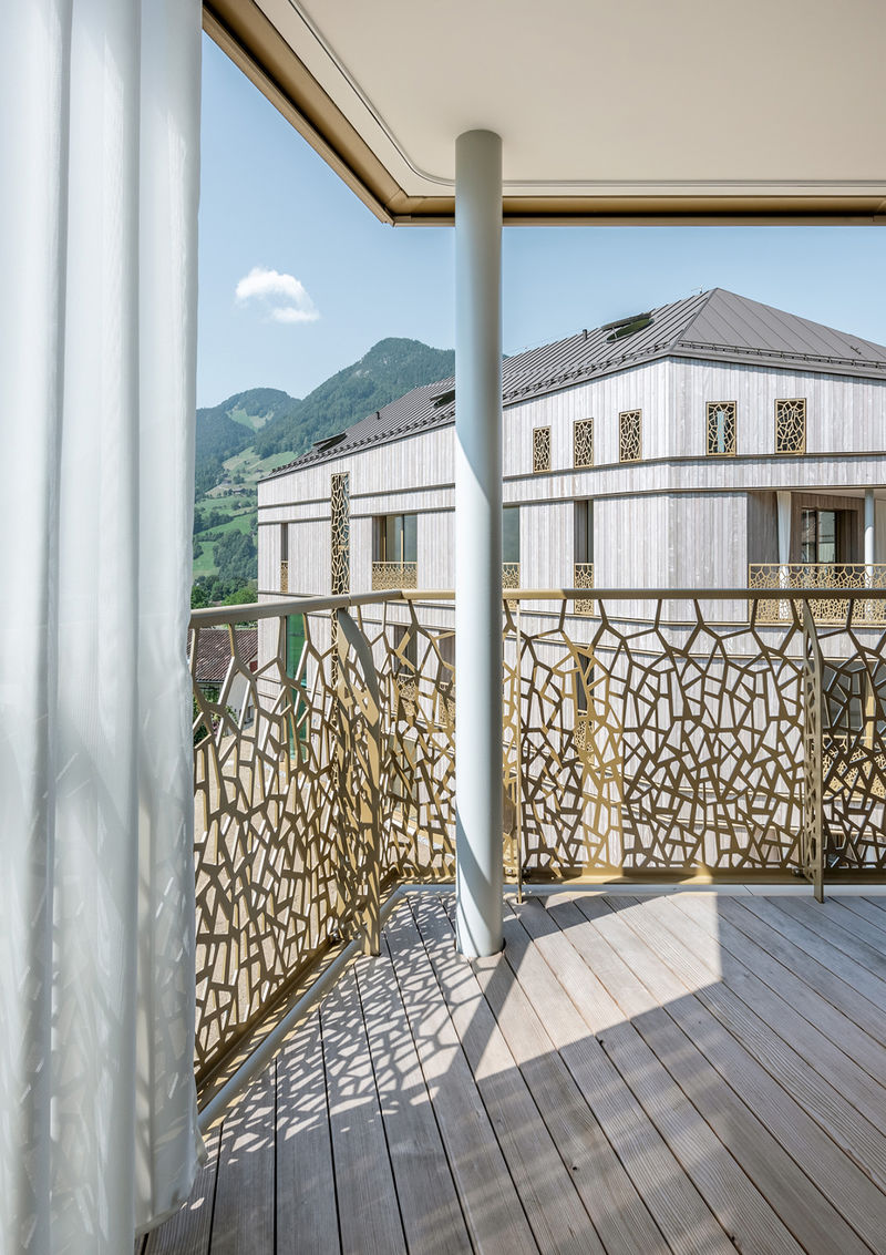 Die Gebäudehülle mit imprägnierten Tannenholzlatten ist aus der Waldlandschaft hergeleitet. Die Geländer sind aus der Rinden Textur der bestehenden Bäume auf dem Gelände entwickelt.