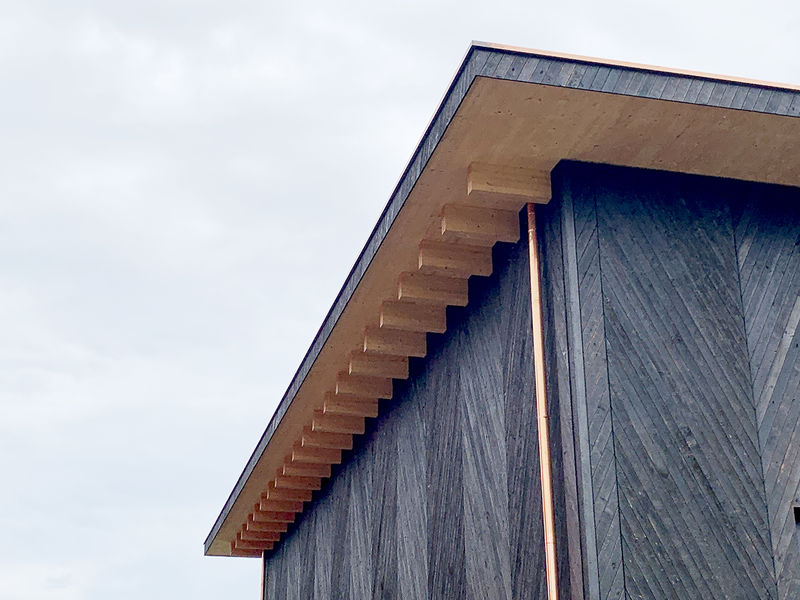 Die relativ grossen Vordächer so wie die Verkohlung der Falzschalung schützen die Holzfassade ohne den Einsatz von Chemikalien.