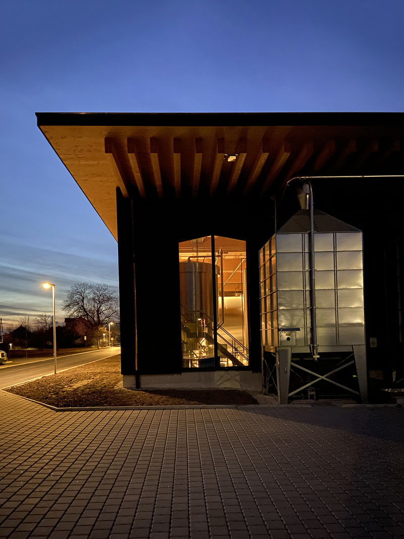 Von Anfang wünschte der Bauherr, dass diese Halle nachhaltig und in regionalem Holz gebaut werden soll. Das äussere Erscheinungsbild des Projekts ist geprägt von einer verkohlten Holzlattenschalung, welche in Anlehnung an die Anordnung der Körner einer Gerstenähre im vertikalen Fischgratmuster angebracht wurden.