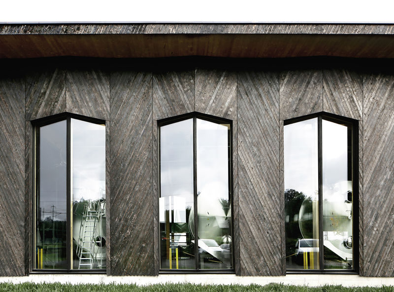 Die Fassade ist als diskret-elegant Blickfang geplant. Die grossen Fassdenflächen aus verkohlten Latten werden durch das vertikal angeordnete Fischgratmuster je nach Lichteinfall in hell-dunkel Streifen unterteilt. Grosse, ins Fassdadenmuster integrierte Fenster leiten den Blick der Passanten (u.a. Zuglinie Aarau-Brugg, Kantonsstrasse) auf die metallisch glänzende Produktionanlage.