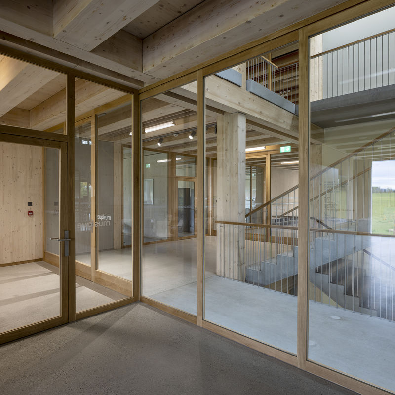 L’école est réalisée en bois prélevé dans les forêts de la Commune. Le bois connecte organiquement la nouvelle école avec son territoire, également un engagement en faveur l’économie locale, les circuits courts, le savoir local des métiers du bois. Un choix permettant de valoriser les ressources présentes sur son territoire et de maîtriser les coûts de fourniture de matériaux. Suivi de traçabilité effectué par des mandataires indépendants. Une forme compacte soutenable économiquement.