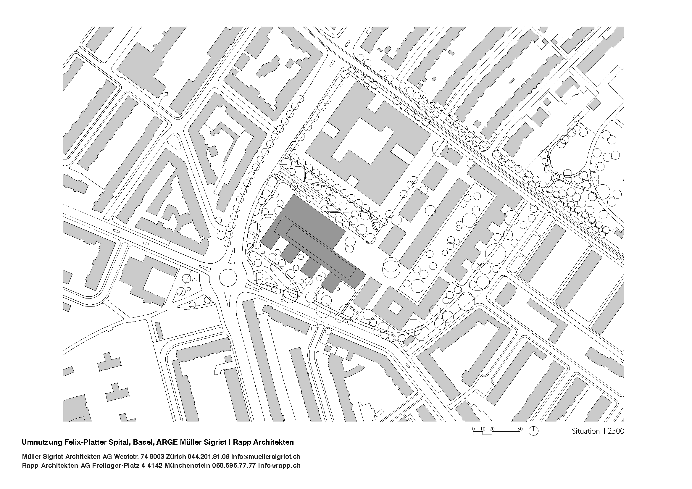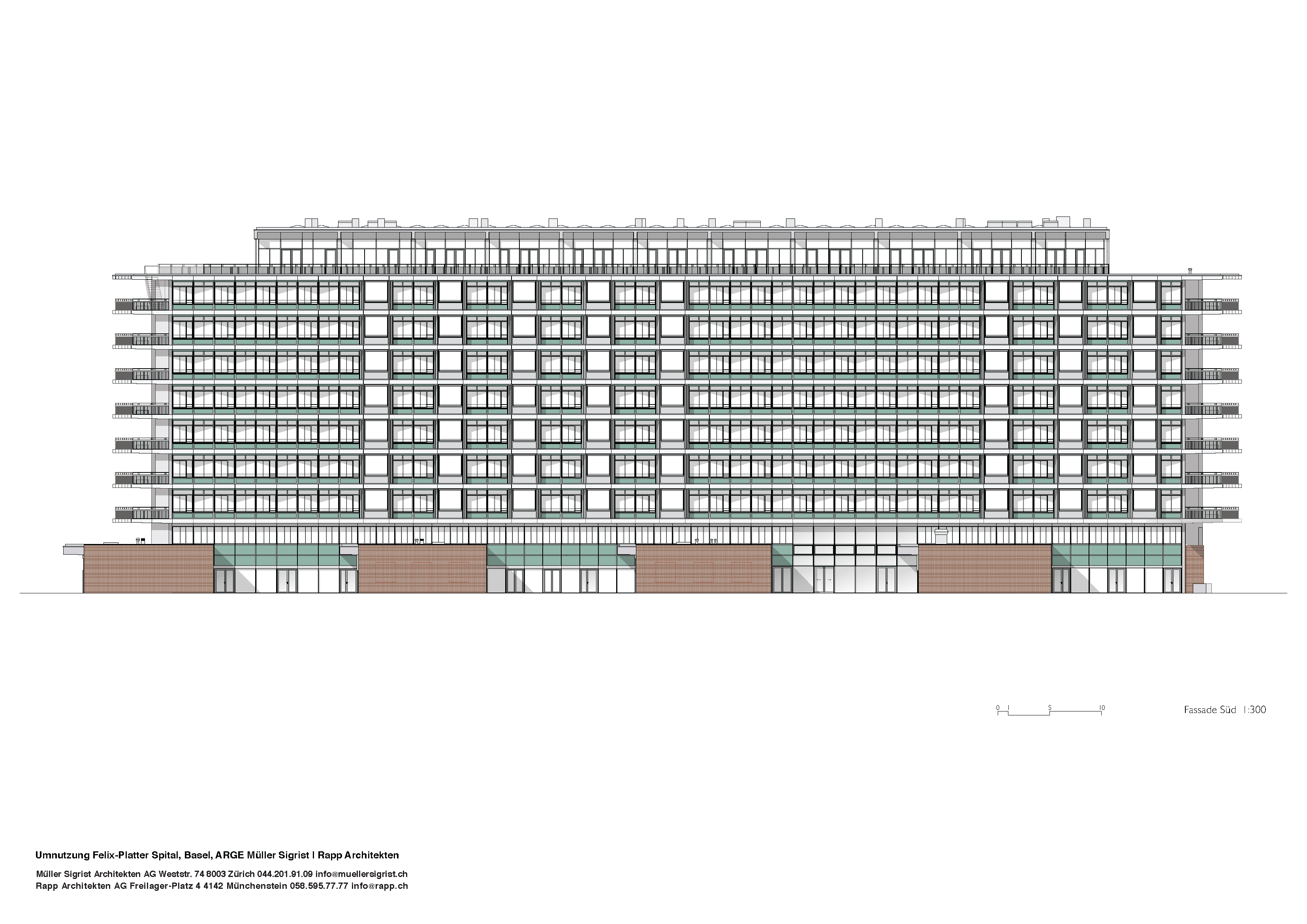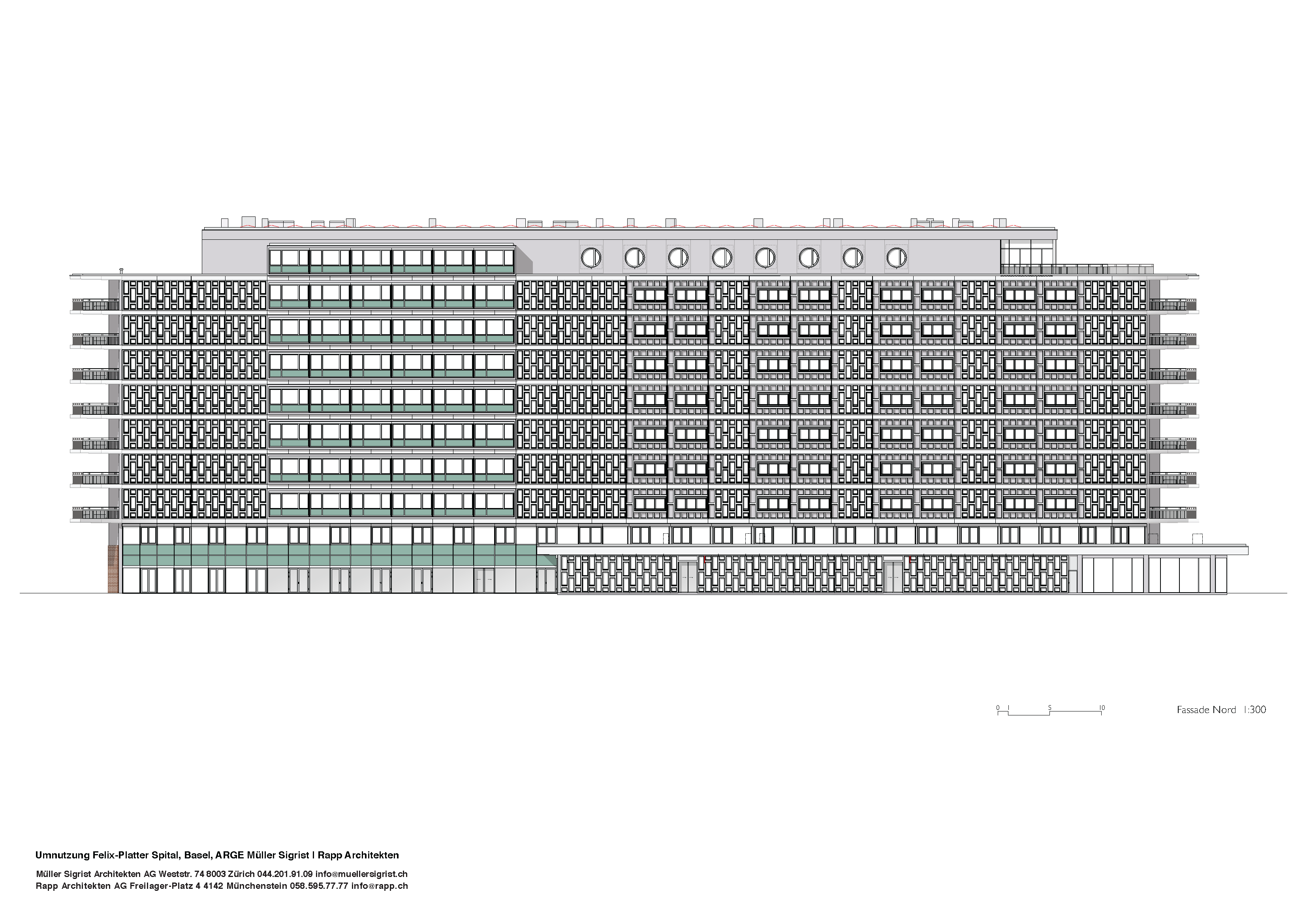 Das 1967 erbaute Felix Platter-Spital sollte, unter der Bauherrschaft der Genossenschaft wohnen & mehr, zum Wohngebäude umgenutzt werden. Mit unterschiedlichen Sanierungsstrategien konnte das Baudenkmal in seiner Erscheinung erhalten und unter erheblichen Aufwendungen zur Erdbebenertüchtigung seiner neuen Nutzung zugeführt werden. Im ehemaligen Felix Platter-Spital sind 134 vielfältige Wohnungen mit gemeinschaftlichen Nutzungen und öffentlichen Angeboten für das Quartier unter einem Dach vereint. Herzstück ist ein doppelstöckiges Foyer, welches die öffentlichen Nutzungen erschliesst und gleichzeitig eine wichtige Querung für das Quartier darstellt. Von hier verbindet die Innere Erschliessung alle Geschosse und führt bis zum Gemeinschaftsraum auf dem Dach.