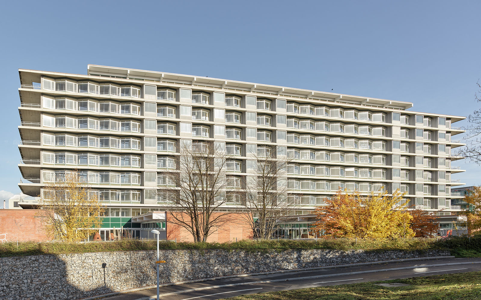 Die beste Umweltbilanz erreicht Beton, wenn er stehengelassen wird. Durch den weitestgehenden Erhalt der bestehenden Bausubstanz bei der Umnutzung des Spitalgebäudes konnten 20'000 Tonnen Beton erhalten werden. Für die gebäudeenergetische Optimierung führt das Projekt auf der Südseite eine neue Fassadenschicht ein. Gegenläufig zur bestehenden Fassade gefaltet, bildet sie die neue Klimagrenze. Für den Erhalt der Nordfassade wurde diese technisch-energetisch saniert.