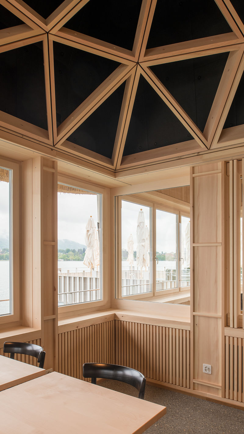 «Low Profil» war ein wichtiges Ziel für uns in der Entwicklung der Architektur des Ortes. Die Fischerstube soll ein Ort für alle sein, wie eine Stube an einem fremden Ort. Und trotzdem wollten wir in der Gaststube über den Menschen einen «Himmel» auftun, der anregt und neugierig macht. Gleichzeitig sind im Stabkuppelwerk von Urs Beat Roth zahlreiche konstruktive und technische Anforderungen vereint, die aus der Zusammenarbeit hervorgingen.