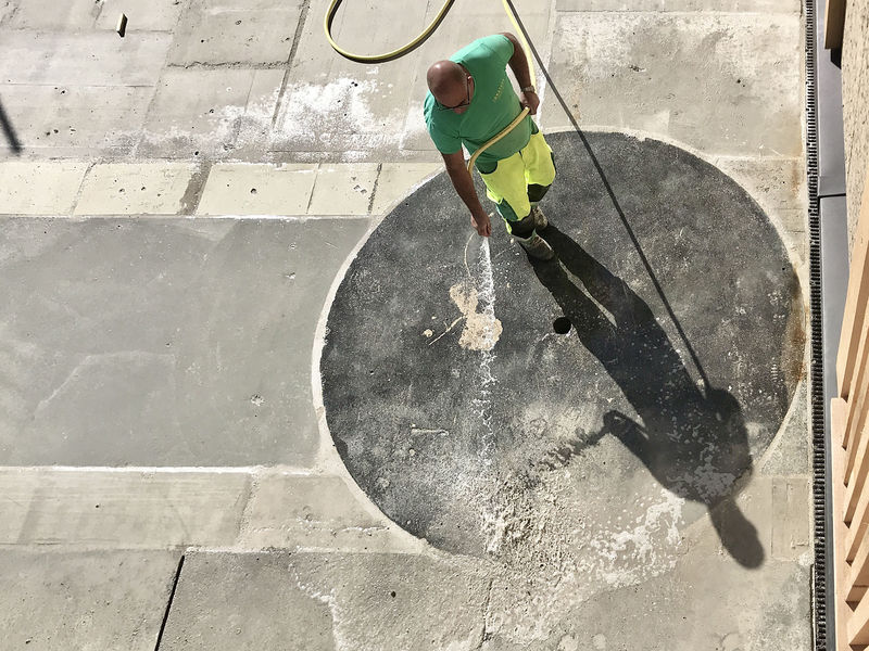 Soutenues par la Commune, une réflexion complète sur le cycle de vie des matériaux du bâtiment a été menée. Le dallage de la cour et du rez-de-chaussée est en béton de réemploi. La structure du bâtiment est conçue en bois massif, sans colle ni clou. Les espaces chauffés de l’étage se parent de liège en façade. Les cloisons de terre crue sont issues des excavations d’autres chantiers. Ces modes constructifs préservent les ressources naturelles, émettent moins de CO2 et facilitent la maintenance.