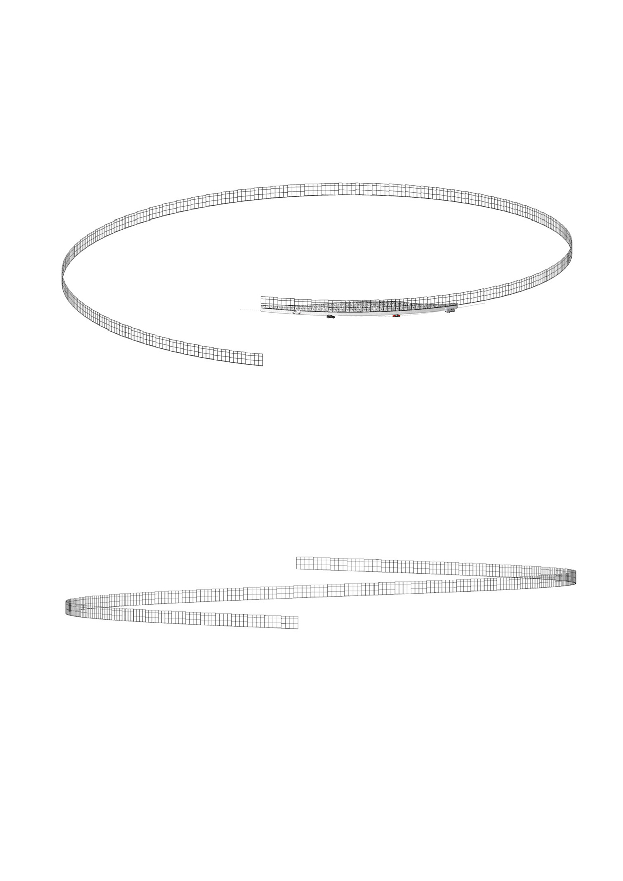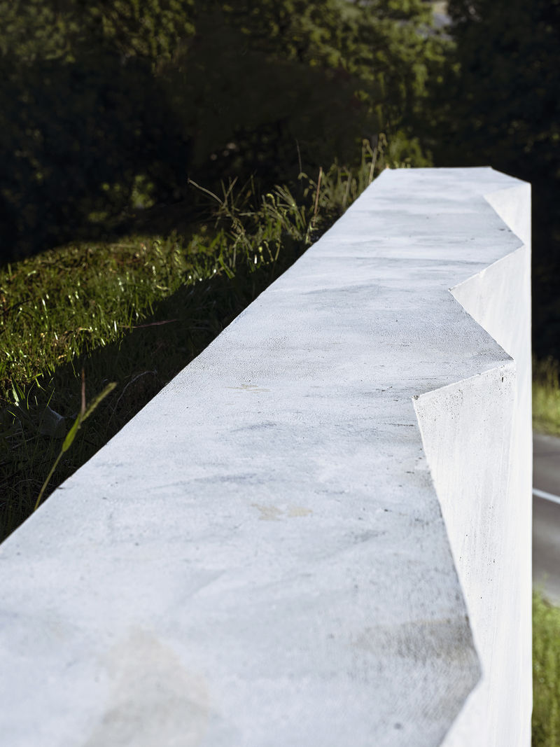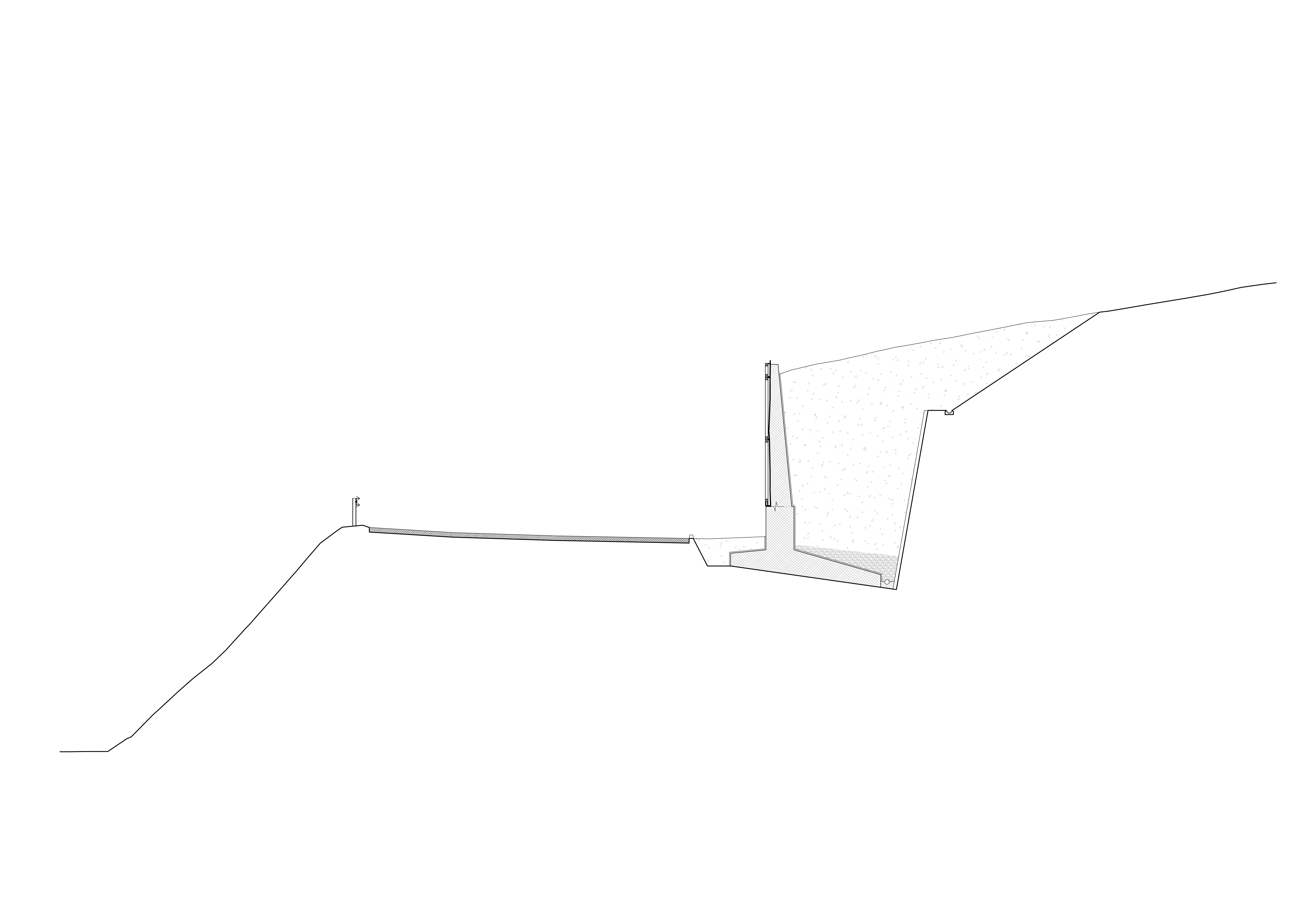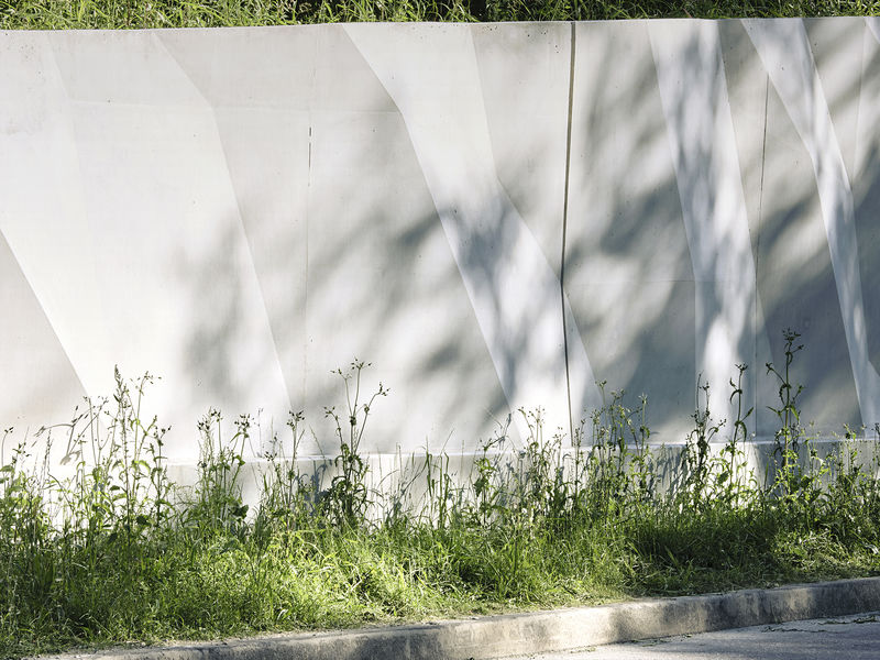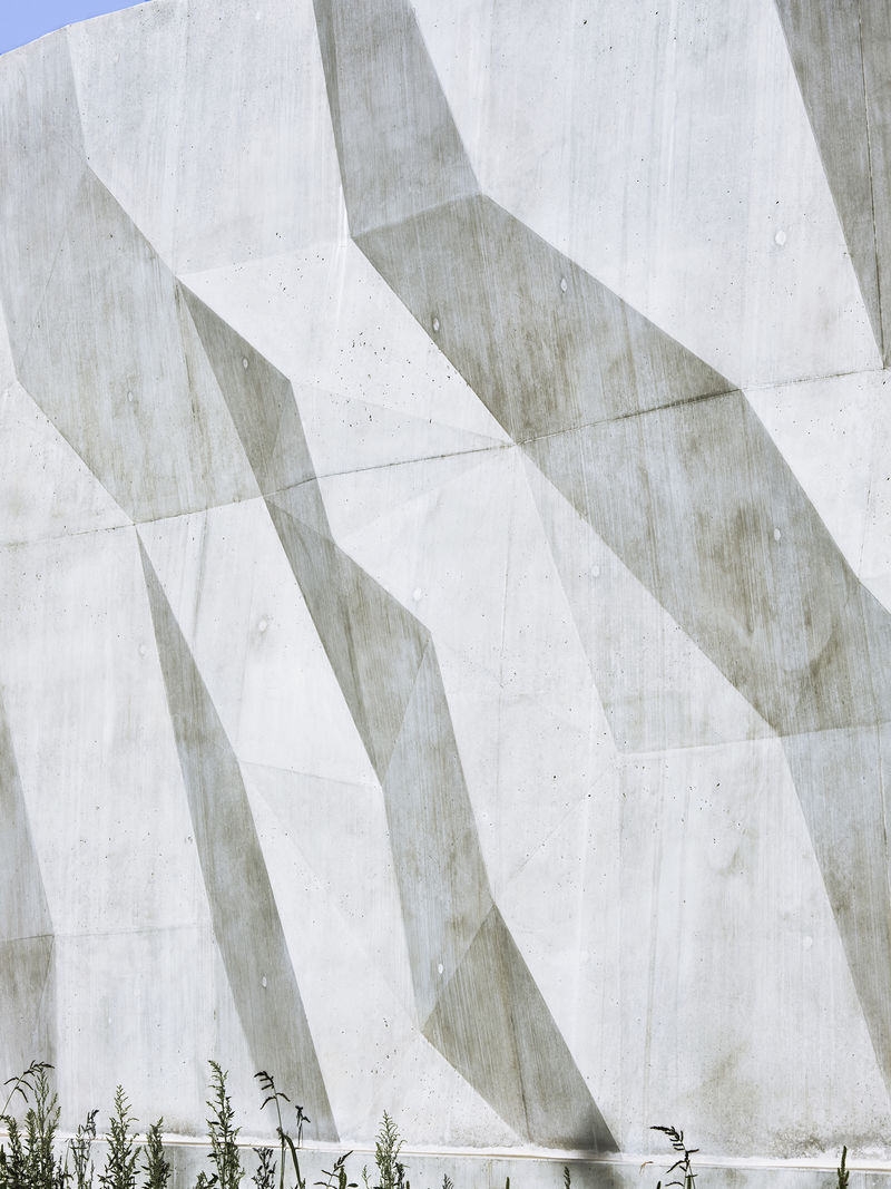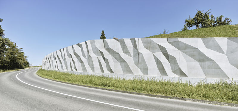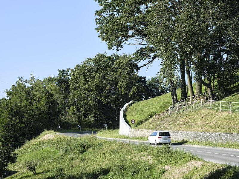 Comme un artéfact fossilisé, découvert lors des fouilles pour les travaux préparatoires, le mur naît dans le virage de la route, s'agrandit en se bombant, puis disparaît à nouveau en sortant de la courbe. Le mur en béton armé prend la forme d'une fraction d’une hélice en plan circulaire, descendant la pente de la colline. Un relief de 10cm de profondeur crée un motif géométrique, ressemblant une formation géologique, tout en restant un élément clairement construit à facettes triangulées.