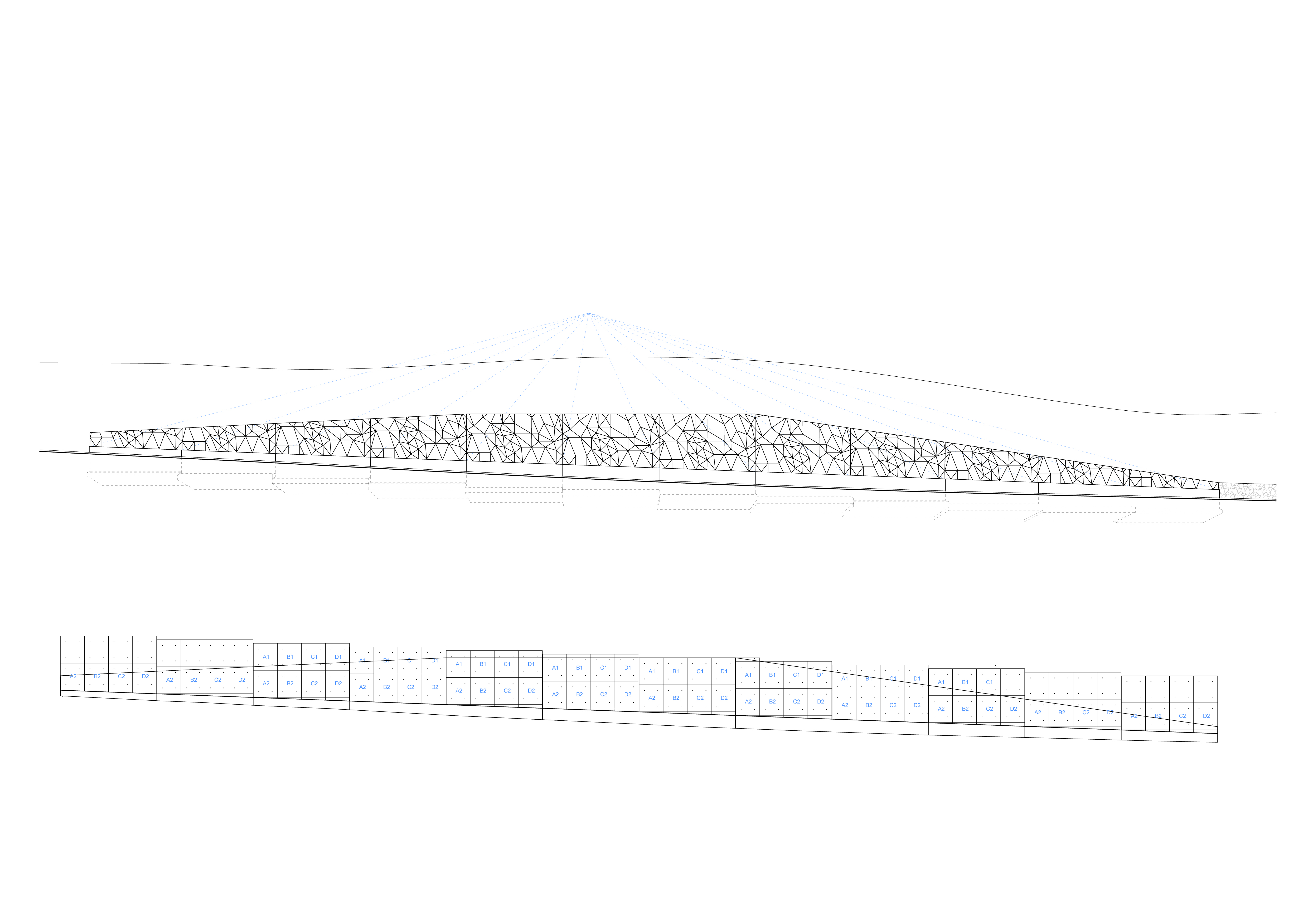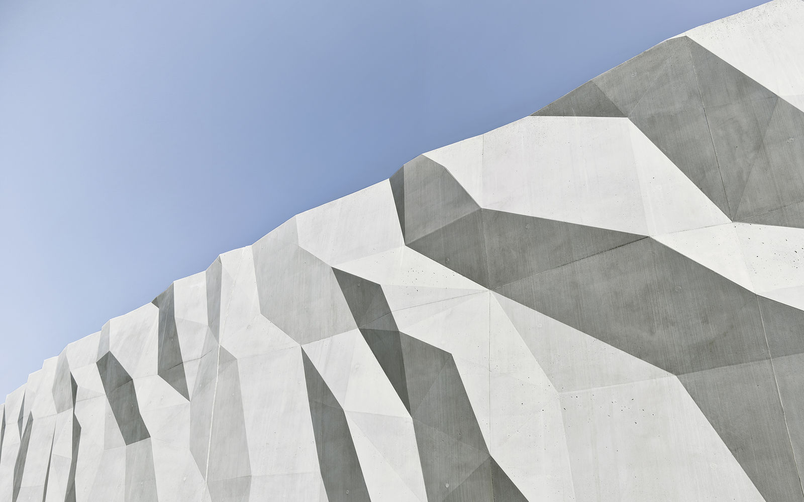 Trouver un système constructif répétitif sans que la répétition devienne trop visible était indispensable au succès de l’ouvrage. Une matrice de coffrage sur mesure sur toute la longueur était irréalisable. Le motif cherche à cacher dans ses facettes une subdivision en 12 parties identiques. Chaque partie est à nouveau subdivisée en 8 sections de 2.4m sur 2.7m de modules de coffrage à ossature métallique standardisée. Ces modules sont traités afin de faciliter le décoffrage et la réutilisation.