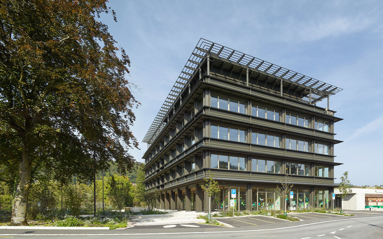 Der Neubau für die EGK-Gesundheitskasse schafft für alle Mitarbeiter eine moderne und nachhaltige Arbeitswelt, im Einklang mit den EGK-Werten: Bescheidenheit, Gesundheitsbewusstsein, Umweltverträglichkeit, Flexibilität. Städtebaulich wird mit dem prägnaten fünfgeschossigen Holzbau eine klare Identität geschaffen: ein Anker für das sich entwickelnde Nauareal in Laufen, das neben Altstadt und Bahnhofsquartier zu einem dritten urbanen Schwerpunkt heranwächst. Der Bau positioniert sich entlang der nord-östlichen Begrenzungslinie, um zur Naustrasse hin einen öffentlichen Lebens- und Erholungsraum aufzuspannen, für Mensch, Flora & Fauna. Als Garten gestaltet bildet dieser den Quartiersauftakt und eine attraktive Adressierung. Die Platzierung ermöglichte auch den Erhalt des identitätsstiftenden Baumbestands, als natürlichen Filter zwischen der stark befahrenen Kantonsstrasse und dem Bürogebäude– der Rahmen für eine angenehme, gesunde Arbeitsatmosphäre, zertifiziert als naturnahes Firmenareal.