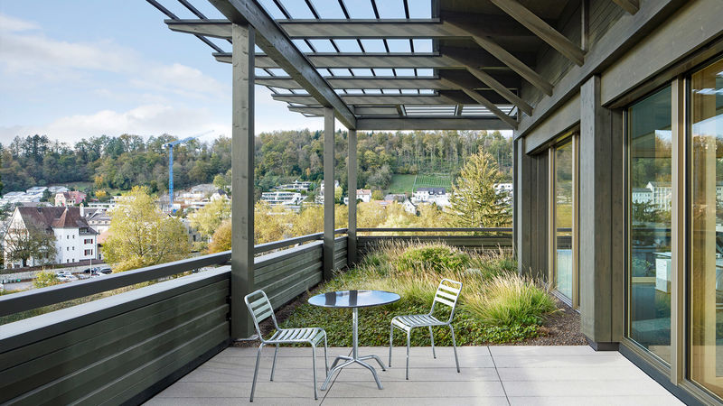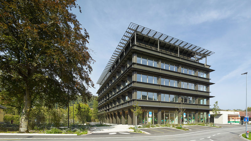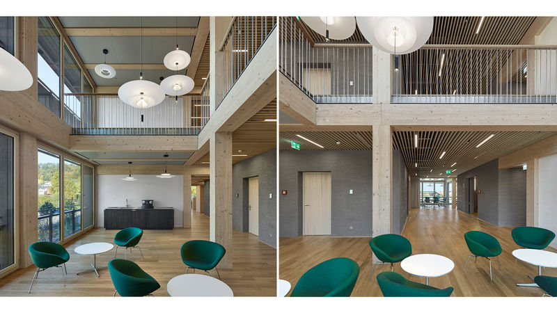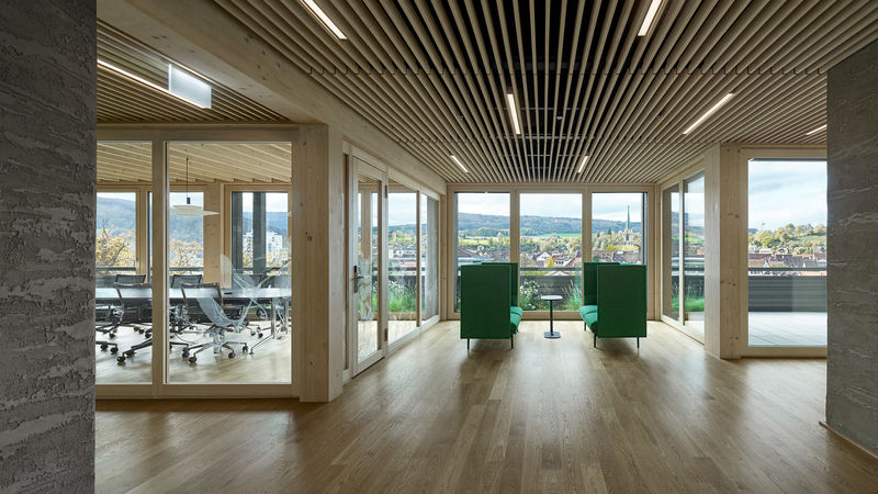 Das Bürogebäude ist für seine Mitarbeitenden gedacht, als Inspirationsquelle für ein gesundes Leben im Einklang mit der Natur: frische Luft, natürliches Licht & Materialen, informelle Begegnungszonen, ein einladendes Treppenhaus, das den Lift aussticht. Die robuste Struktur des Pfosten-Riegel-Holzbaus lässt auch zukünftig vielfältige Nutzungen zu, bis hin zur Vermietung halber Geschosse an Dritte.