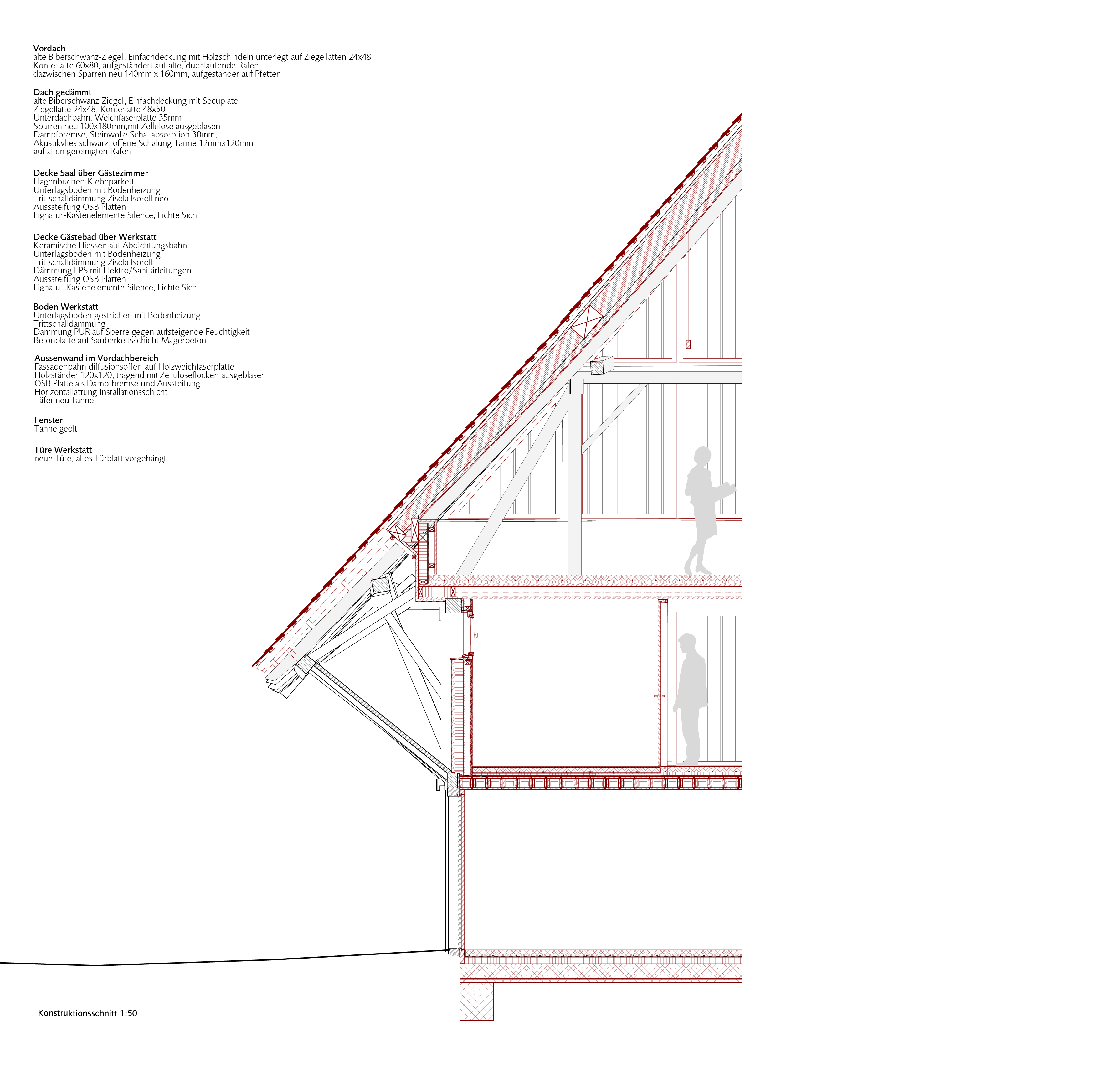 Unsere Haltung war: Vorgefundenes nutzen, wo es möglich war und symbiotisch ergänzen, wo es nötig war. So konnte sehr viel Substanz erhalten werden. Das ausgebaute Material wurde auf seine Wiederverwertbarkeit geprüft. So konnten alle alten, teils imposant breiten Bretter wieder eingebaut werden, ebenso die handgefertigten Dachziegel. Der Fussabdruck vom Gebäude wurde nicht vergrössert und wo immer möglich wurde mit Holz gearbeitet und damit CO2 im Gebäude gespeichert.