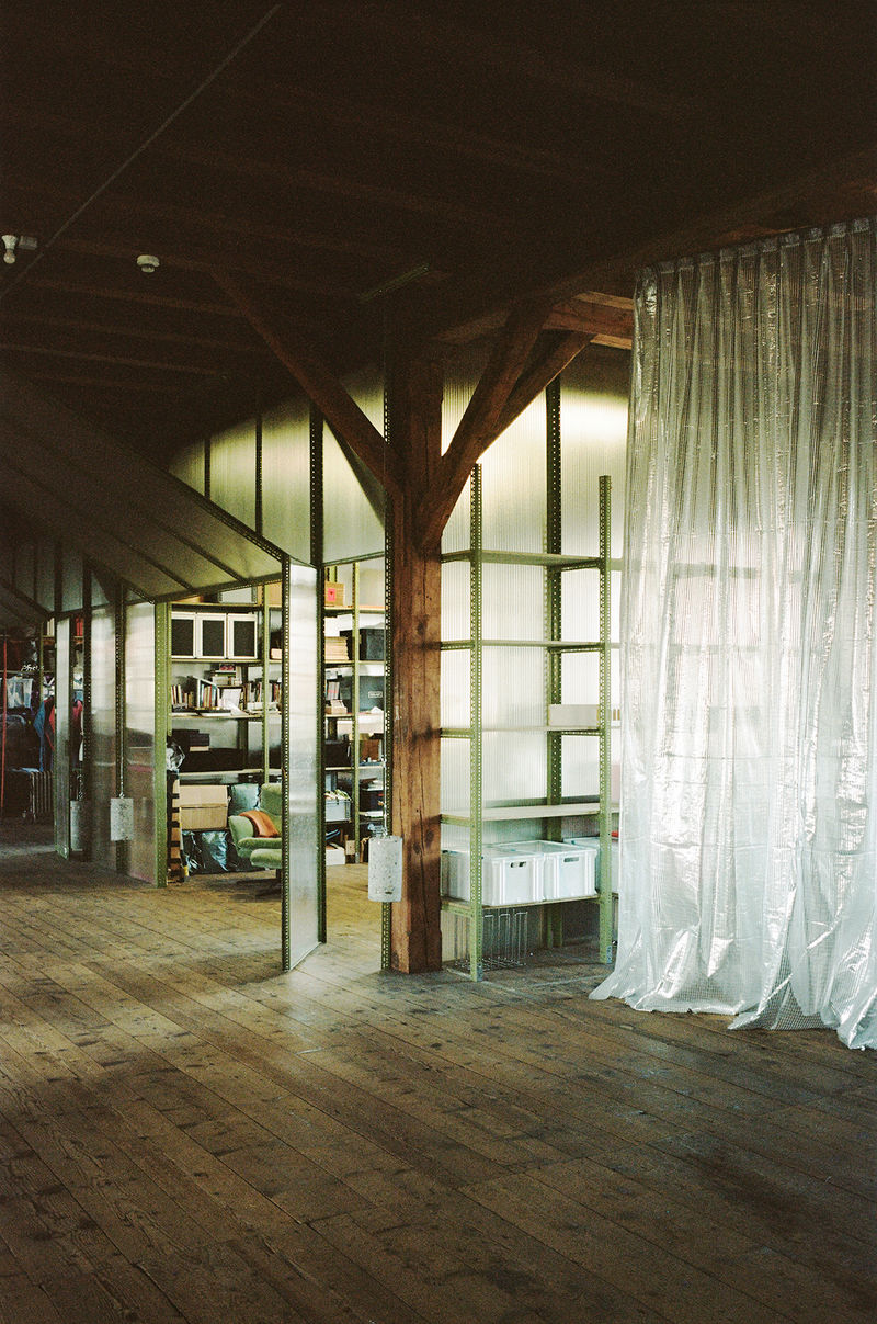 Der 400 m2 grosse Raum wird durch transluzente Trennwände aus Stegplatten unterteilt, um die natürliche Belichtung zu gewährleisten und um die Beheizung im Winter auf kleinerem Raum zu minimieren. Mit Toren lassen sich die Ateliers zueinander öffnen und erlauben verschiedene Konfigurationen in Symbiose mit dem Projektraum, der mit flexiblen Bühnenelementen und rollenden Tresen ausgestattet ist.