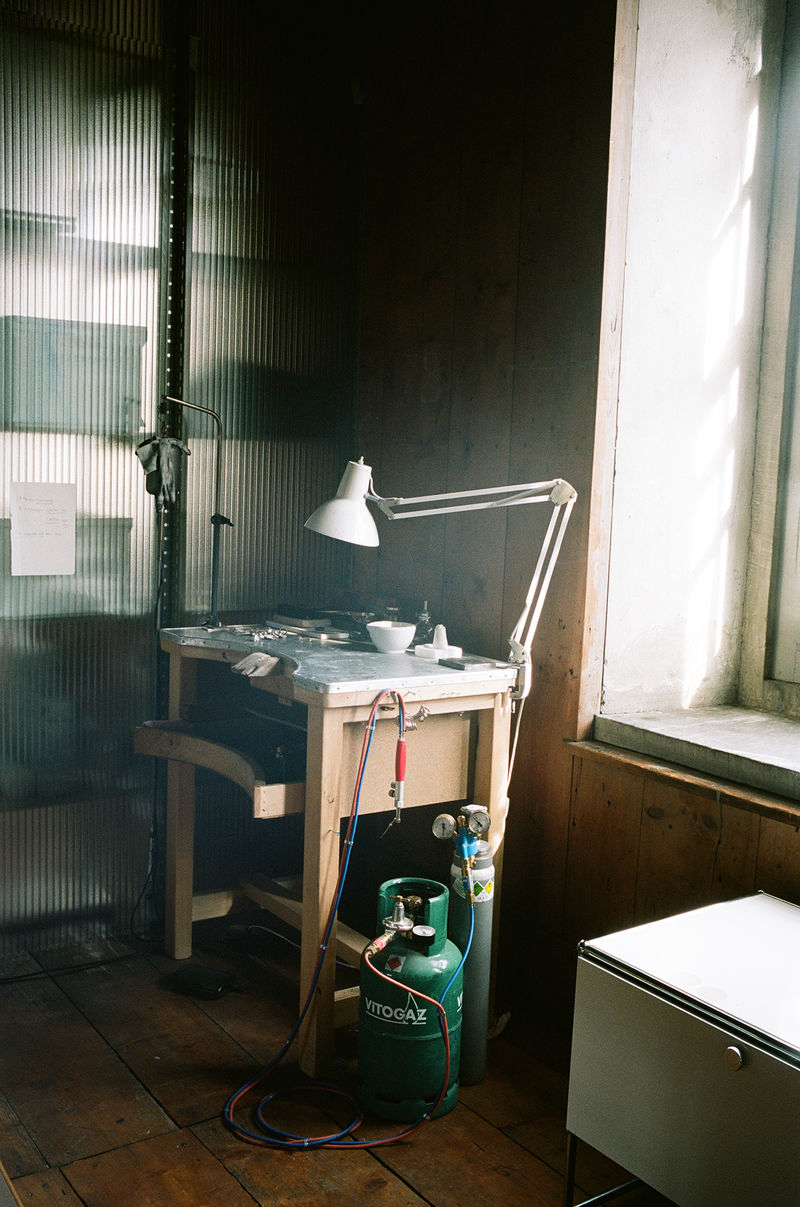 Militär und Polizei haben als vorherige Nutzerinnen Elemente hinterlassen, mit denen weitergearbeitet wurde. Beispielsweise dienen Metallplatten zurückgelassener Schiesswände als Ablagen von Tresen und Küche. Brauchbares bleibt in Gebrauch – den Fokus auf Weiter- und Wiederverwenden teilen die Nutzer:innen der Ateliers. Die industriellen Lastenregale verweisen auf die urbane Produktion heute.