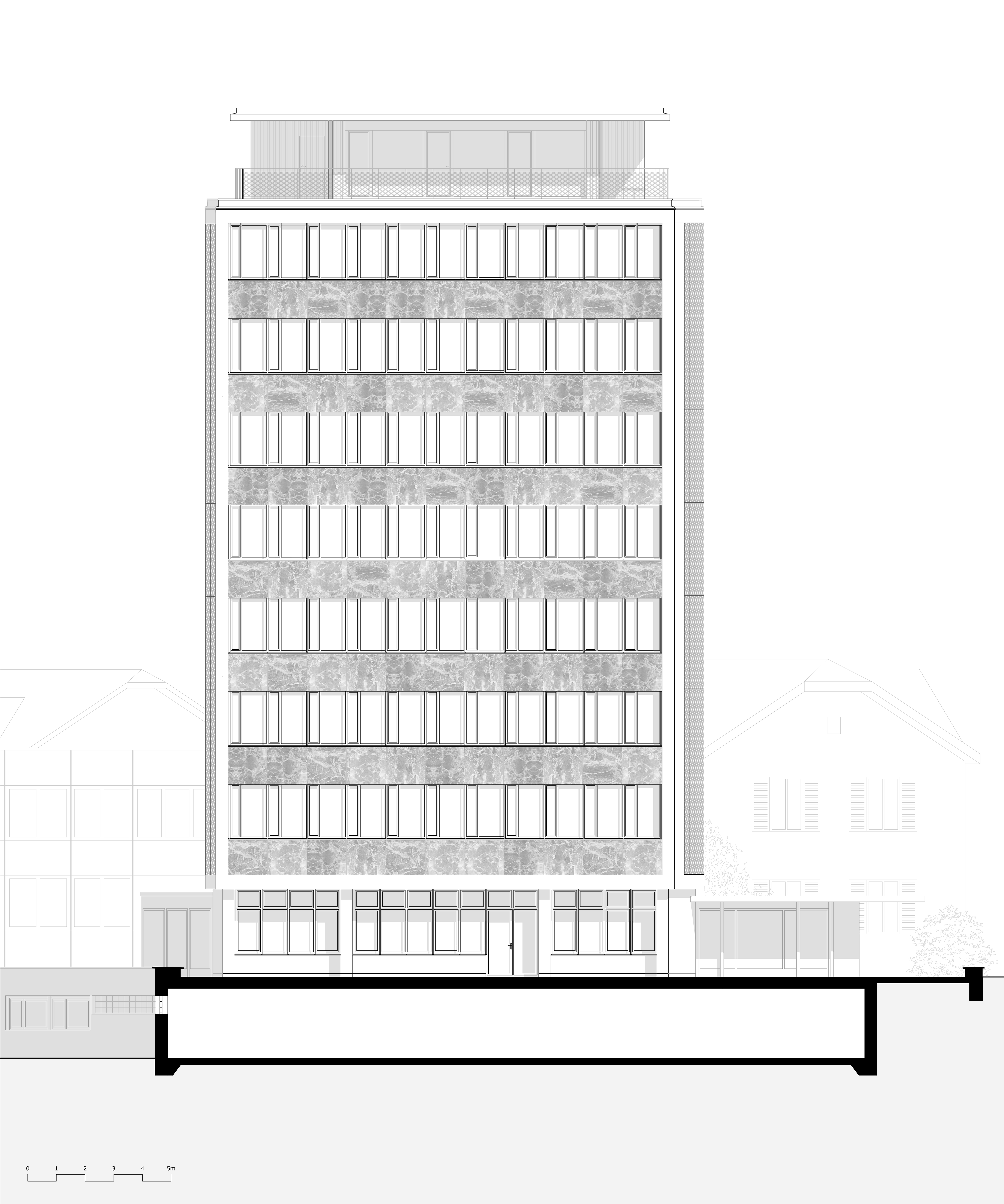 Die klare Formensprache, der gläserne Erschliessungskern und der Mantel aus wertigem Naturstein verleiht dem Gebäude eine sinnliche Ordnung. Das wohlproportionierte Hochhaus wirkt auf den Betrachtenden ansprechend und schafft einen identitätsstiftenden Ort. Die dem Gebäude zugeführt Nutzung ermöglicht eine aktives erleben der Innenräume und der dazugehörigen Terrasse. Somit bleibt die ästhetische Wertschätzung erhalten und durch das öffentliche Café wir das Gebäude nahbar und zugänglich.