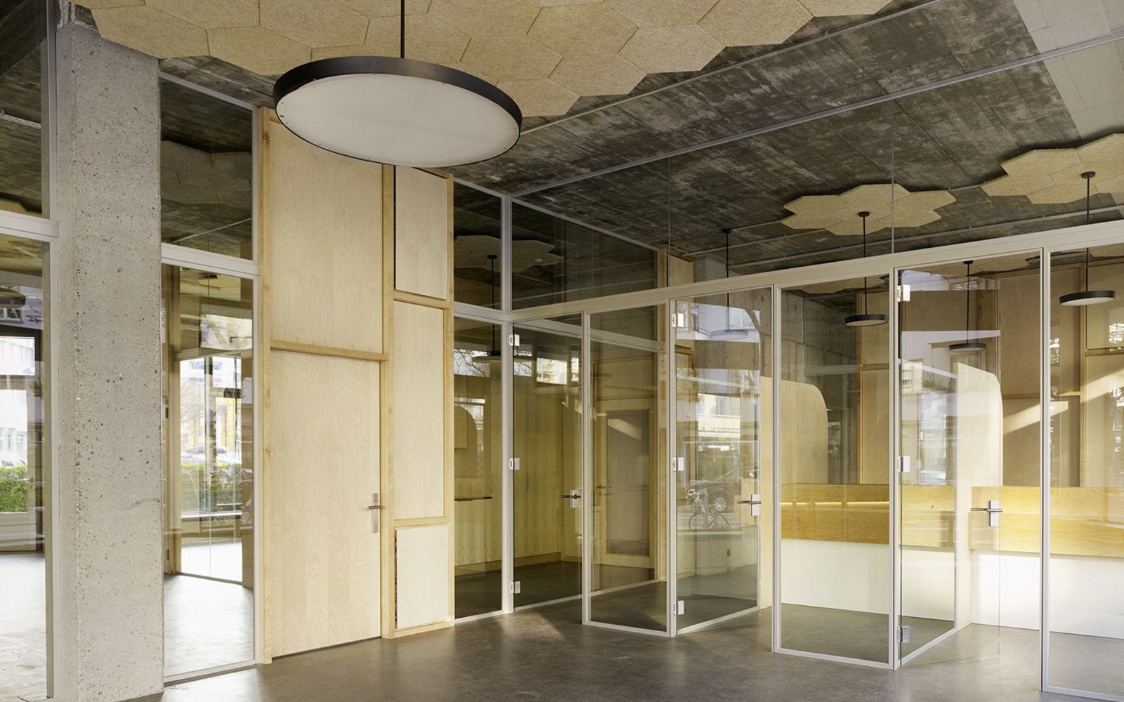 Das Bürogebäude der Unia steht im Zürcher Stadtteil Aussersihl, dem traditionellen Quartier der Arbeiter:innenbewegung. Der Umbau des einfachen, spätmodernen Baus schafft mit der Materialisierung und Installation eine Stimmung, die weniger an eine klassische Büroumgebung erinnert, sondern eine etwas raue, aber warme Atmosphäre schafft, die zur Arbeitswelt der Gewerkschaftsmitglieder passt.