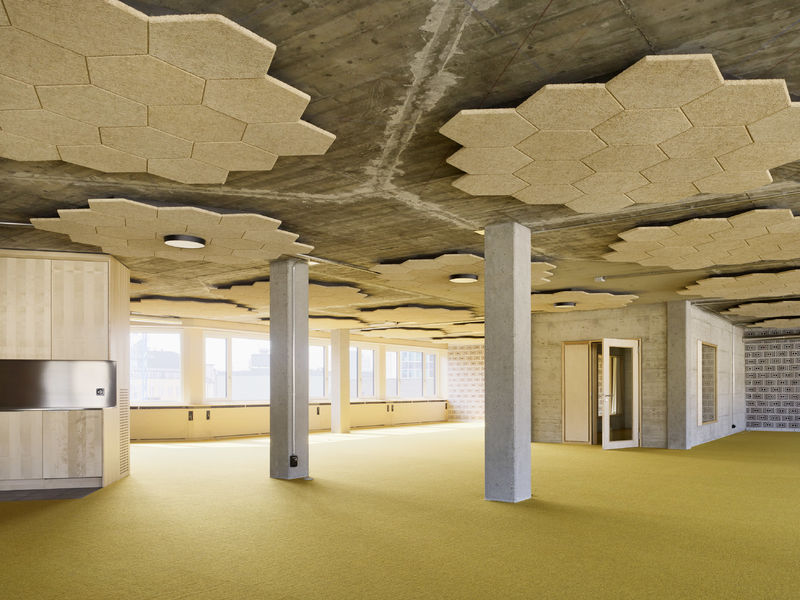 Das 1972 erbaute Bürogebäude, dessen Fassadensanierung 2014 zu Problemen mit Überhitzung im Innern geführt hatten, wurde 2022-2023 komplett haustechnisch saniert. Ein neues Haustechnikkonzept konnte die Betriebsenergie um ca 80% reduzieren und dazu die Überhitzung aus der Welt schaffen. Da dieses System mit der thermischen Aktivierung der Gebäudestruktur arbeitet, mussten dafür möglichst viel Stützen und Decken unverkleidet bleiben. Architektonisch führte dies zu einem Edelrohbau mit sichtbarer Struktur, Aufputzleitungen und aufgesetzten Akustikpanelen. Die verwendeten Materialien sind naturbelassen: roher Beton, Birkenholz, Holzwollpanele, Wollteppich, Backstein sowie Glas. Eine neu geschaffene Dachterrasse mit Solardach schafft einen zusätzlichen Arbeits- und Begegnungsraum mit grossartiger Aussicht. Die Fassade blieb aussen praktisch unverändert.