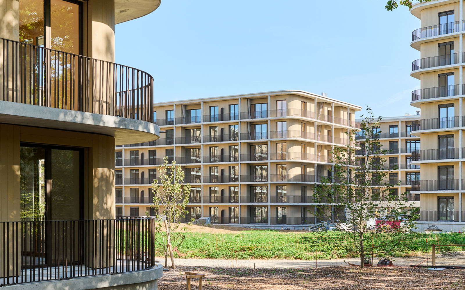 Un soin a été porté aux aménagements et usages extérieurs, avec plantations en pleine terre et maintien de la topographie existante. Le projet est au bénéfice d’une haute performance énergétique avec un CAD sur énergies renouvelables, l’optimisation des gains solaires et une protection climatique grâce aux balcons filants le long d’une enveloppe performante composée d’éléments préfabriqués en bois.