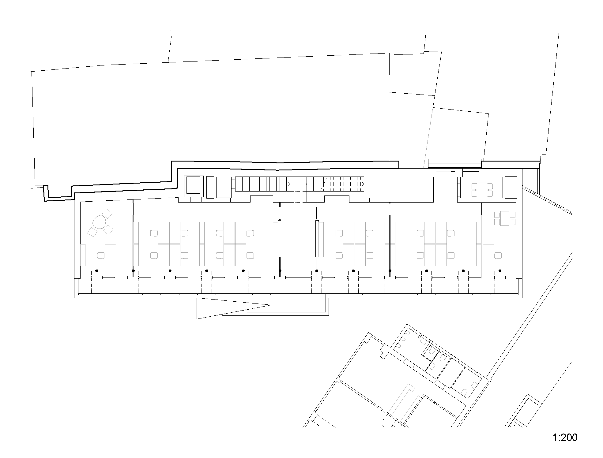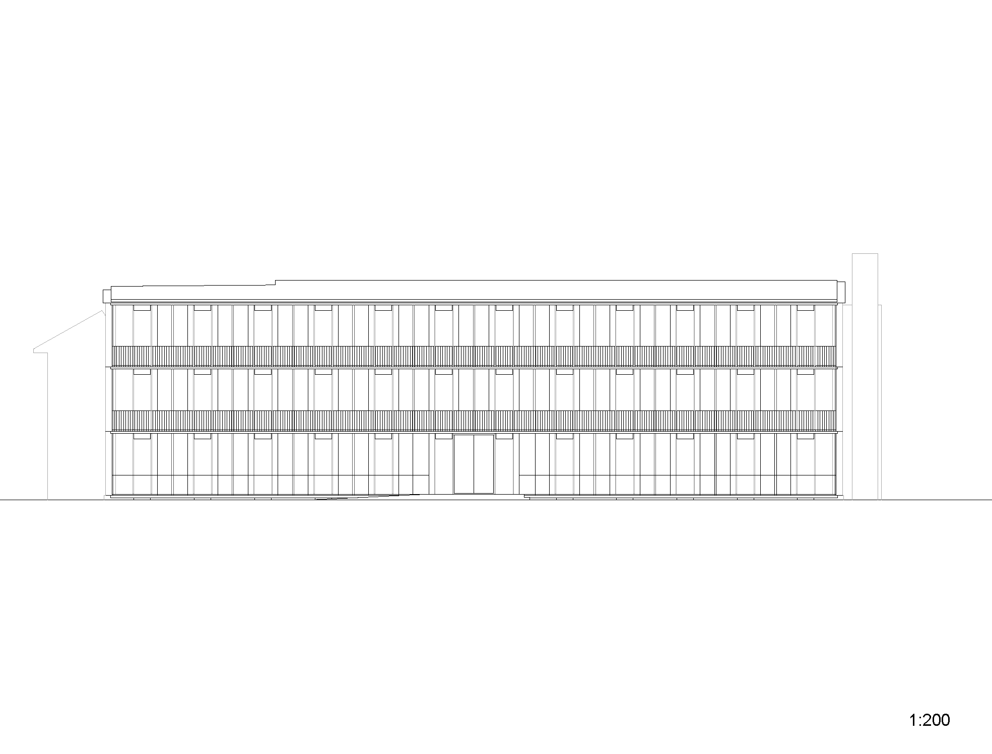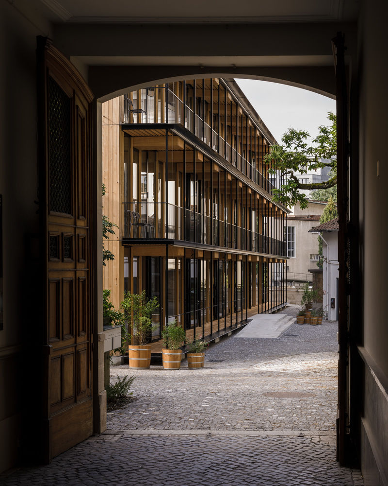Der Entwurf berücksichtigt den städtebaulichen Kontext: die Gebäudetypologie orientiert sich an der historischen Hofbebauung zusammen mit einem Pultdach und verknüpft eine zeitgemäße Bautiefe mit dem ursprünglichen Volumen. Konstruktiver Wetterschutz und Laubenraum betonen Tiefe und Maßstab, anstatt einer flächigen Verglasung. Der halböffentliche Hofraum lädt mit Bänken und Bäumen zum Verweilen ein. Die Bauweise respektiert die Geschichte des Ortes und korrigiert frühere "Bausünden".