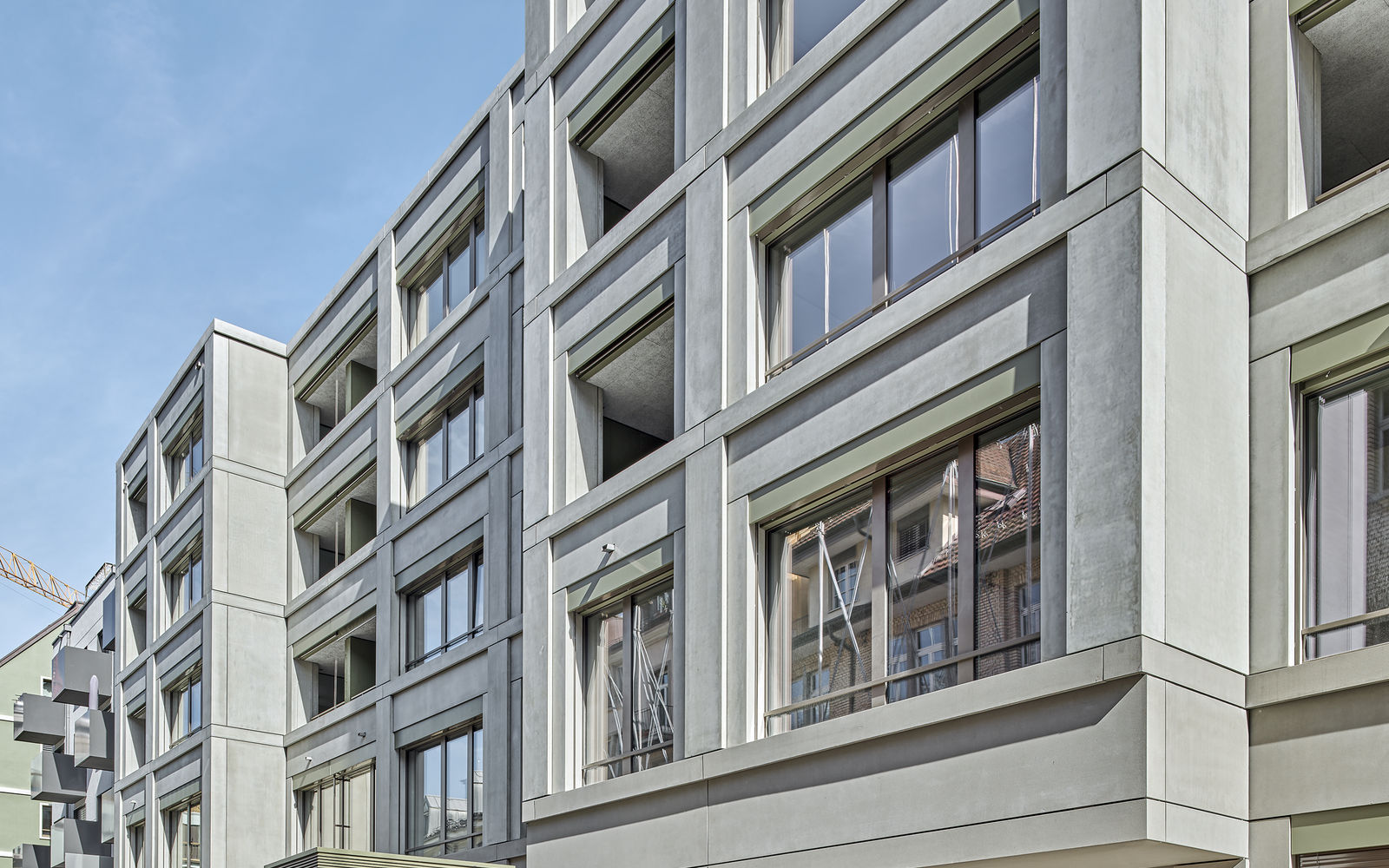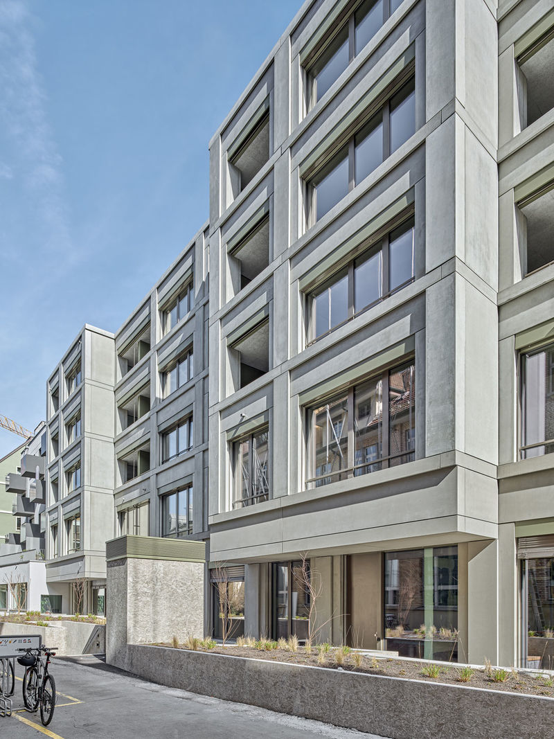 In der Aussensicht werden die Hof- und Strassenseite architektonisch differenziert behandelt, um auf beiden Seiten ein möglichst integratives Erscheinungsbild zu schaffen: Richtung Limmatstrasse wird der Strassenraum präzise gefasst und die quartiertypische Gliederung umgesetzt. Auf der Hofseite entsteht aufgrund der Vor- und Rücksprünge eine kleinteiligere Wirkung, die einen wohnlichen Massstab und räumliche Schwerpunkte schafft.