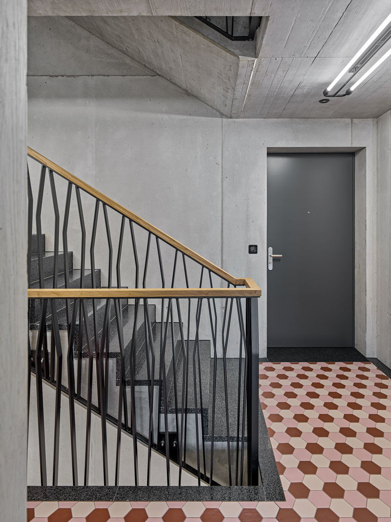 Neben der Anlehnung an die quartiertypischen Proportionen und mineralische Materialisierung, wird die gemeinschaftliche Dachterrasse als Merkmal mit hohem Wiedererkennungswert, typisch für Zürich, gestaltet. Der Innenhof wird zugunsten aller aufgewertet und das Sechseck als wiederkehrendes identitätsstiftendes Gestaltungselement im gesamten Projekt genutzt; einschliesslich des Bodens, des Dachs, der Signaletik und der Türgriffe.