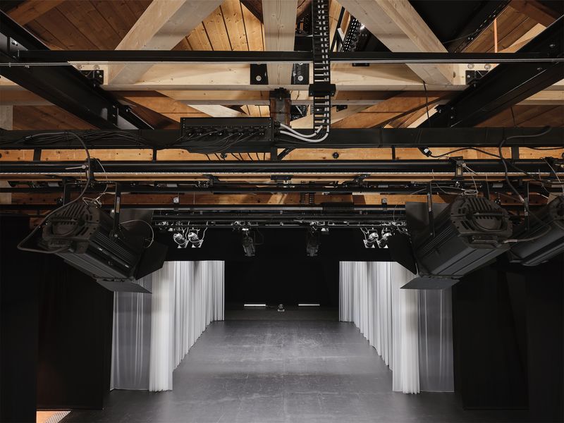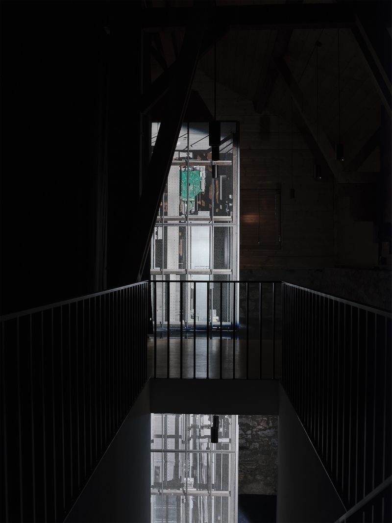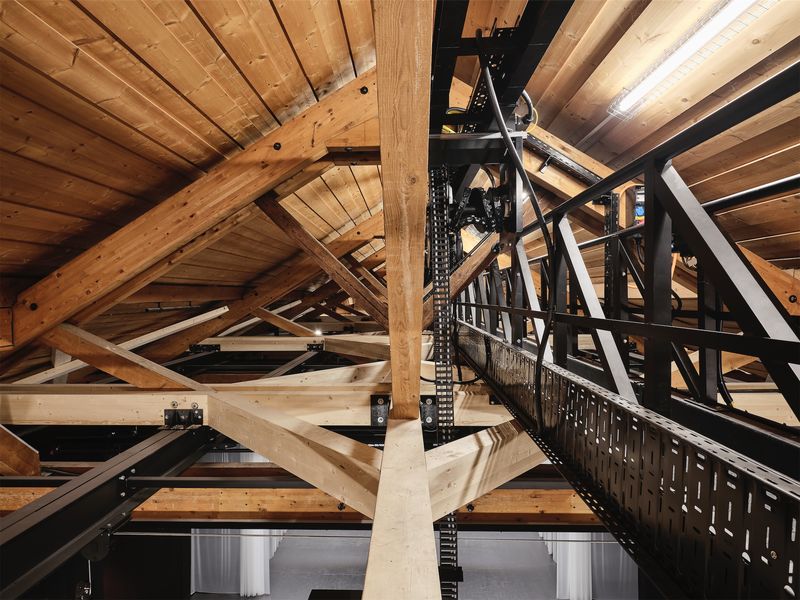 Développée en plusieurs parties, la première résout la problématique d’accessibilité à la salle principale, la deuxième intervention concerne la modification complète de la charpente. Elle est rehaussée d’environ 70cm pour permettre le passage d’une toute nouvelle installation scénographique ainsi qu’un pont de visite répondant au besoin de productions artistiques contemporaines et futures.