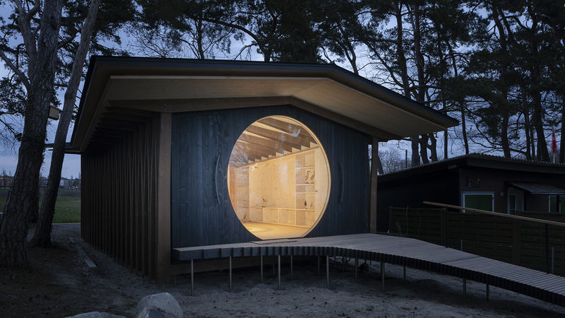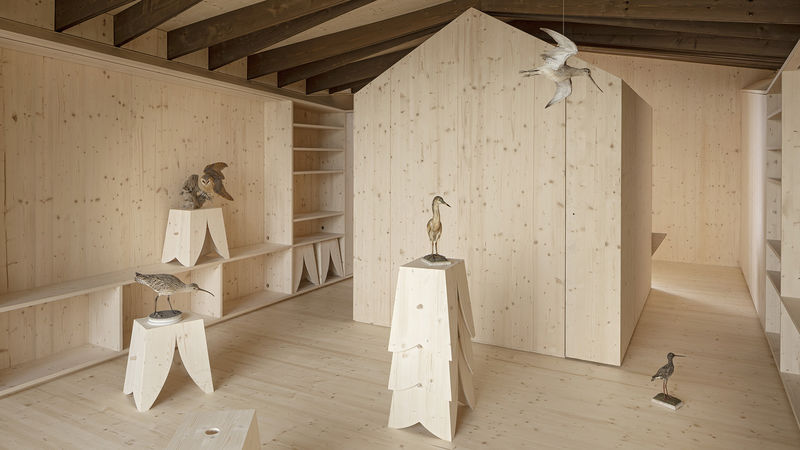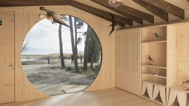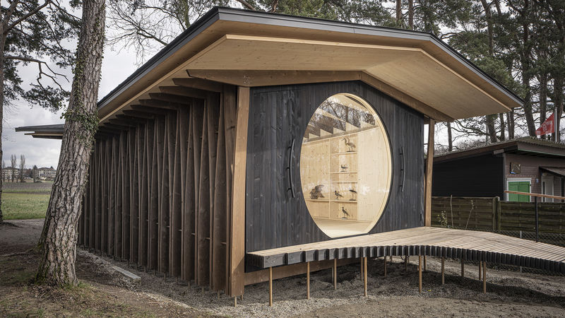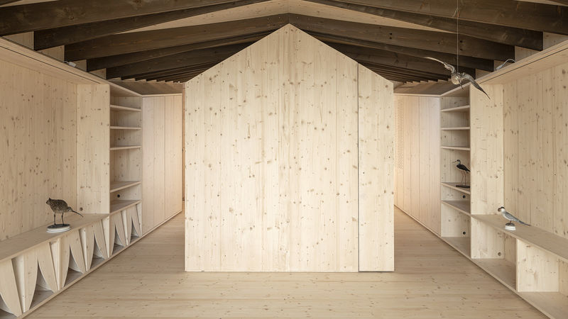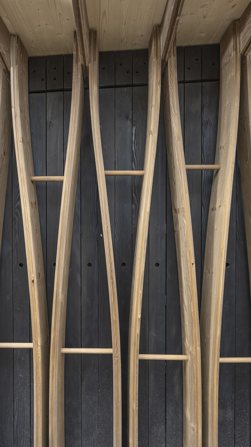 Sa structure se compose de planches verticales massives assemblées sans colle qui se plient pour former une résille de petites ogives tressées en trois dimensions évoquant la tension et la finesse du nid. Une fenêtre ronde de grande dimension attire l’œil et oriente le regard du visiteur, rappelant la camera obscura ou le nichoir. La Maison de l’Île aux oiseaux présente structurellement un contraste saisissant entre l’utilisation de techniques contemporaines et de méthodes plus anciennes.