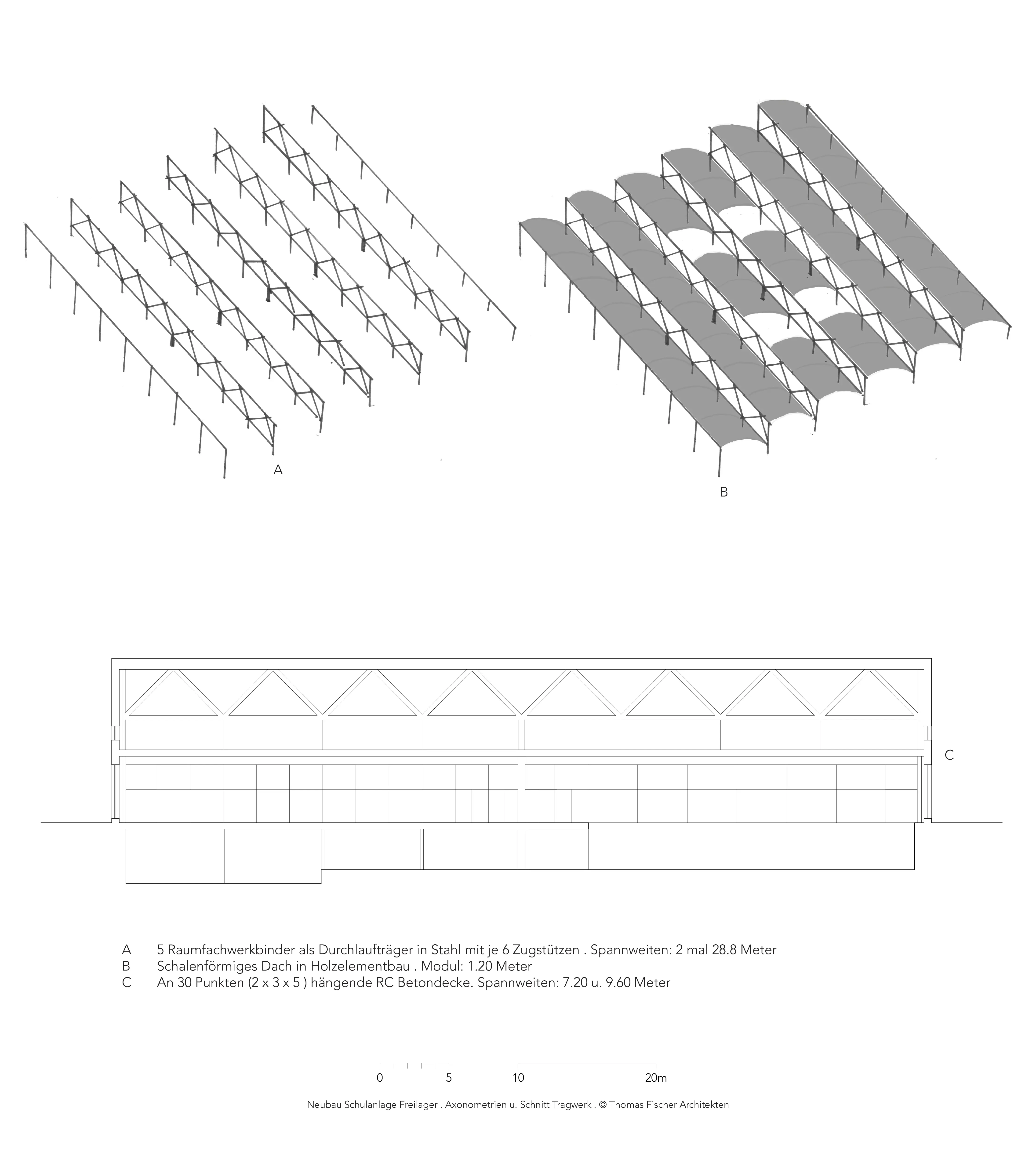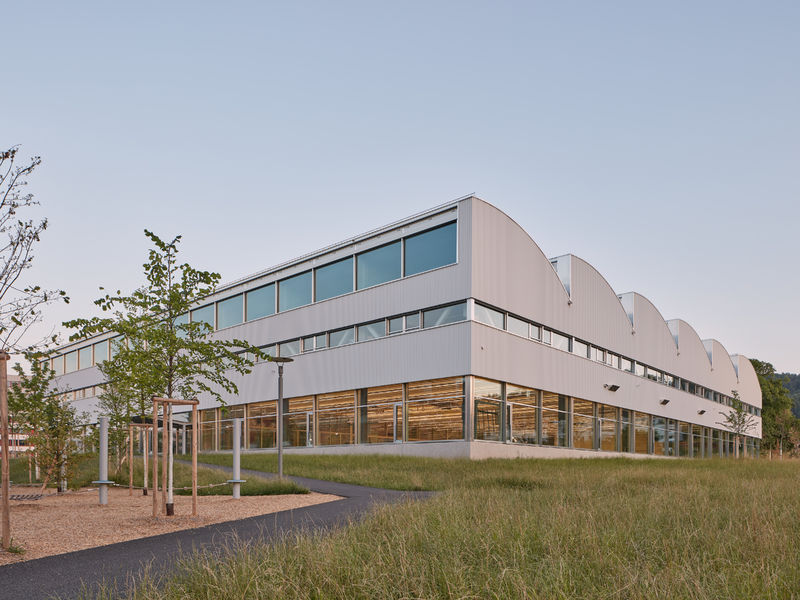 Das Bauwerk ist Teil einer Reihe prototypischer Schulbauprojekte von Thomas Fischer, die bezüglich Tageslichtnutzung, Landflächenverbrauch und Nachhaltigkeitsbilanz hohe Umweltstandards erfüllen. Eine Schlüsselrolle spielt das transdisziplinär entwickelte hybride Hängetragwerk aus durchlaufenden Stahlfachwerkbindern in Kombination mit einem maximierten Anteil an Holzelementbau, das die Anforderungen an innovativer Pädagogik, Flexibilität, Kompaktheit und Grauenergiebilanz zur Deckung bringt.