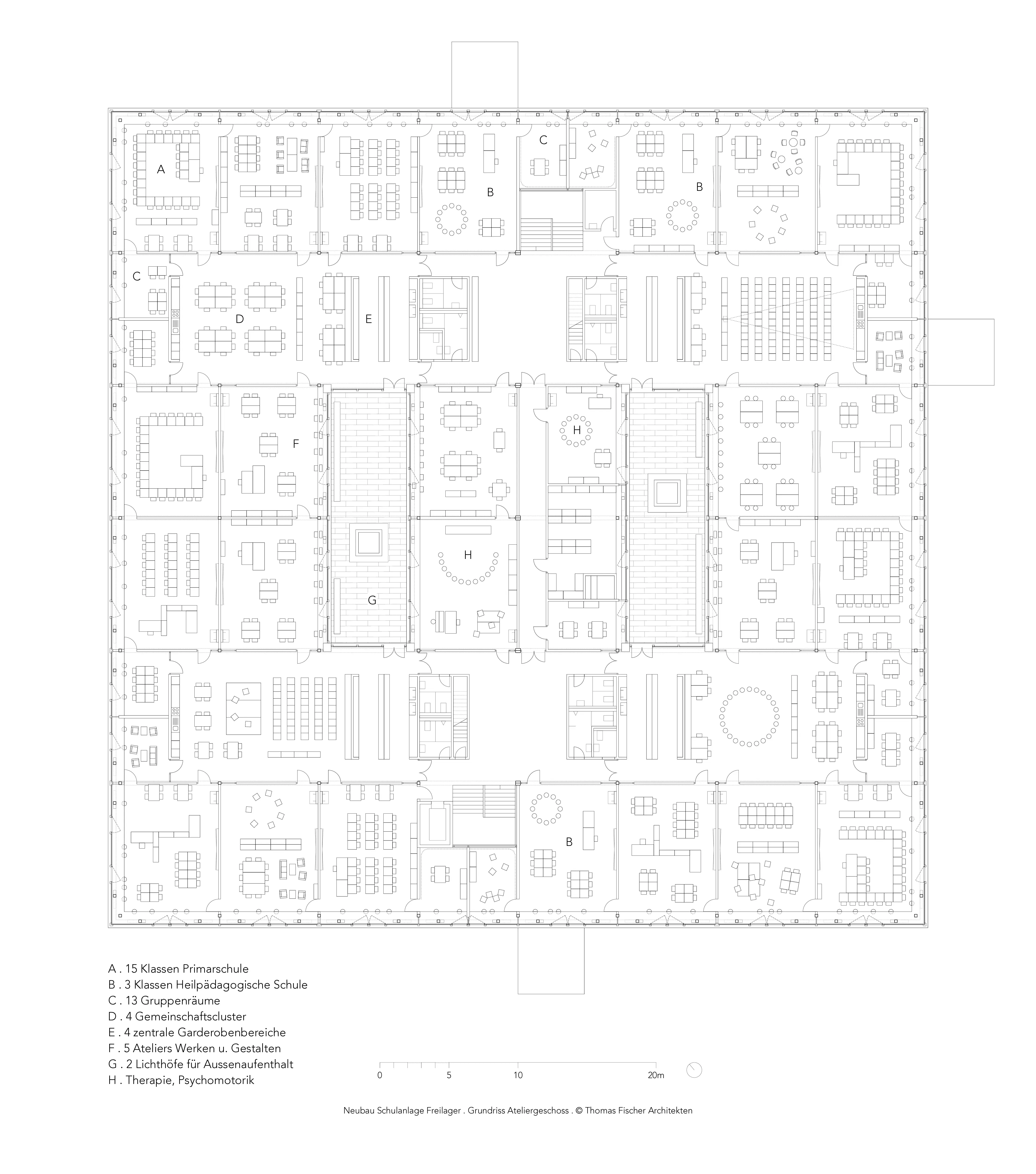 Die Atelierschule umfasst flächenintensive Räume wie Schwimm- und Sporthallen, Mehrzweckräume und Säle für Theaterbühnen, die Musikschule, die Bibliothek und den Speisesaal. Sie verbindet große und kleine Küchen genauso wie die üblichen Klassenräume, Gruppenräume, Werkateliers und Therapieräume für alle und insbesondere für die integrierten drei heilpädagogischen Schulklassen. Unterschiedliche Akteure und Anspruchsgruppen finden achtsam zusammen unter ein Dach.