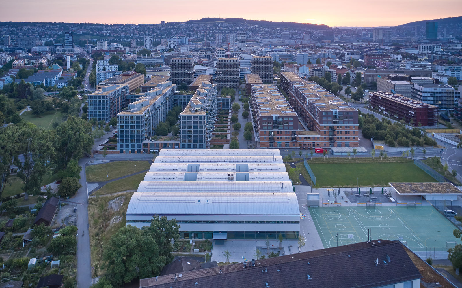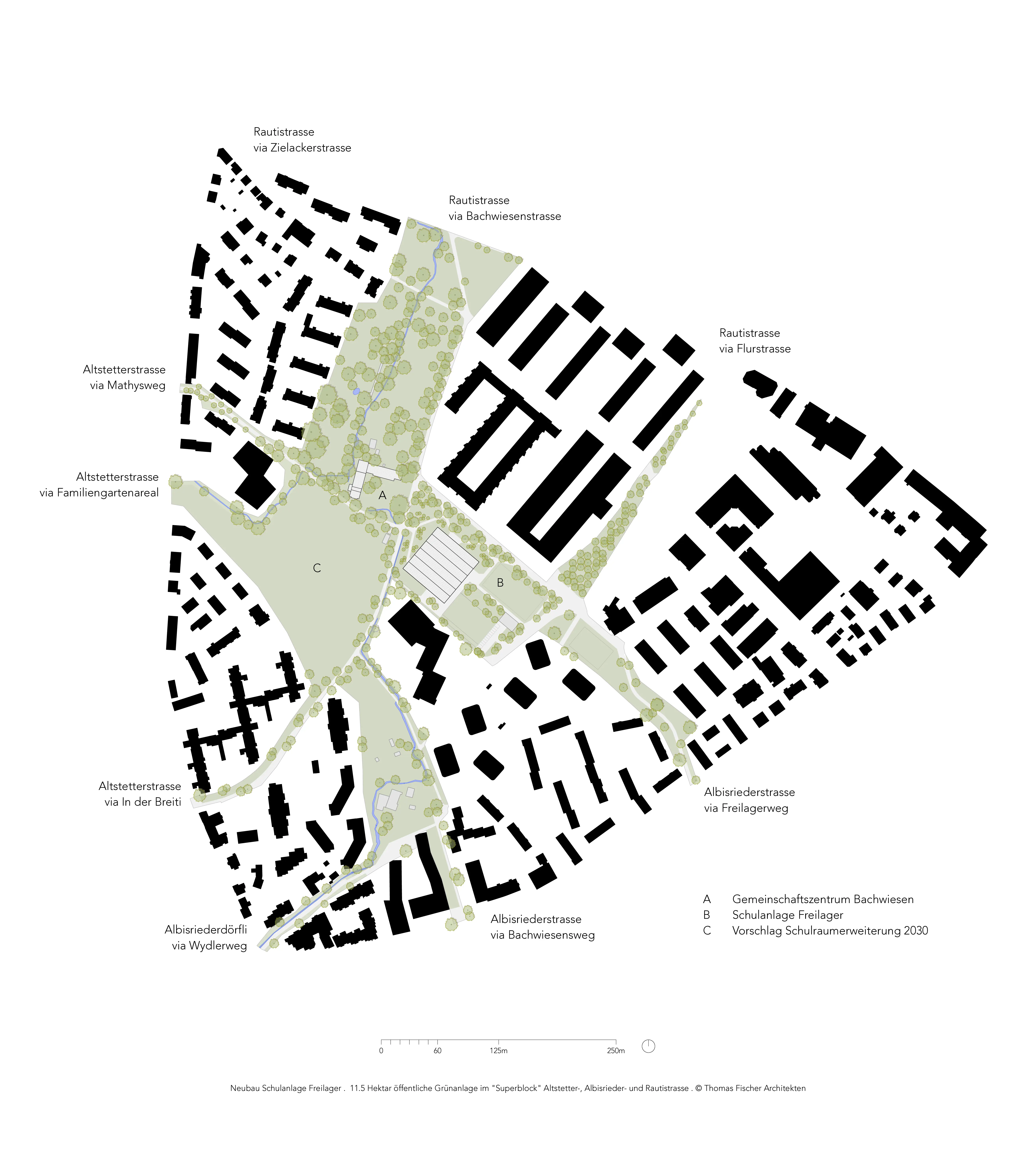 Eigentlicher Genius Loci - weit über den Projektperimeter der Schule hinaus - ist die ca. 11.5ha grosse, weit verzweigte Grünraumstruktur innerhalb des von baulicher Transformation geprägten Stadtgevierts. Die Schulanlage Freilager verstärkt im Dialog mit dem bestehenden Quartierzentrum Bachwiesen dessen Mitte - räumlich und sozial. Durch Umwidmung von ehemals der Vereinsnutzung vorbehaltenen Familiengärten in einen für alle zugänglichen Stadtpark wird die öffentliche Teilhabe verstärkt.
